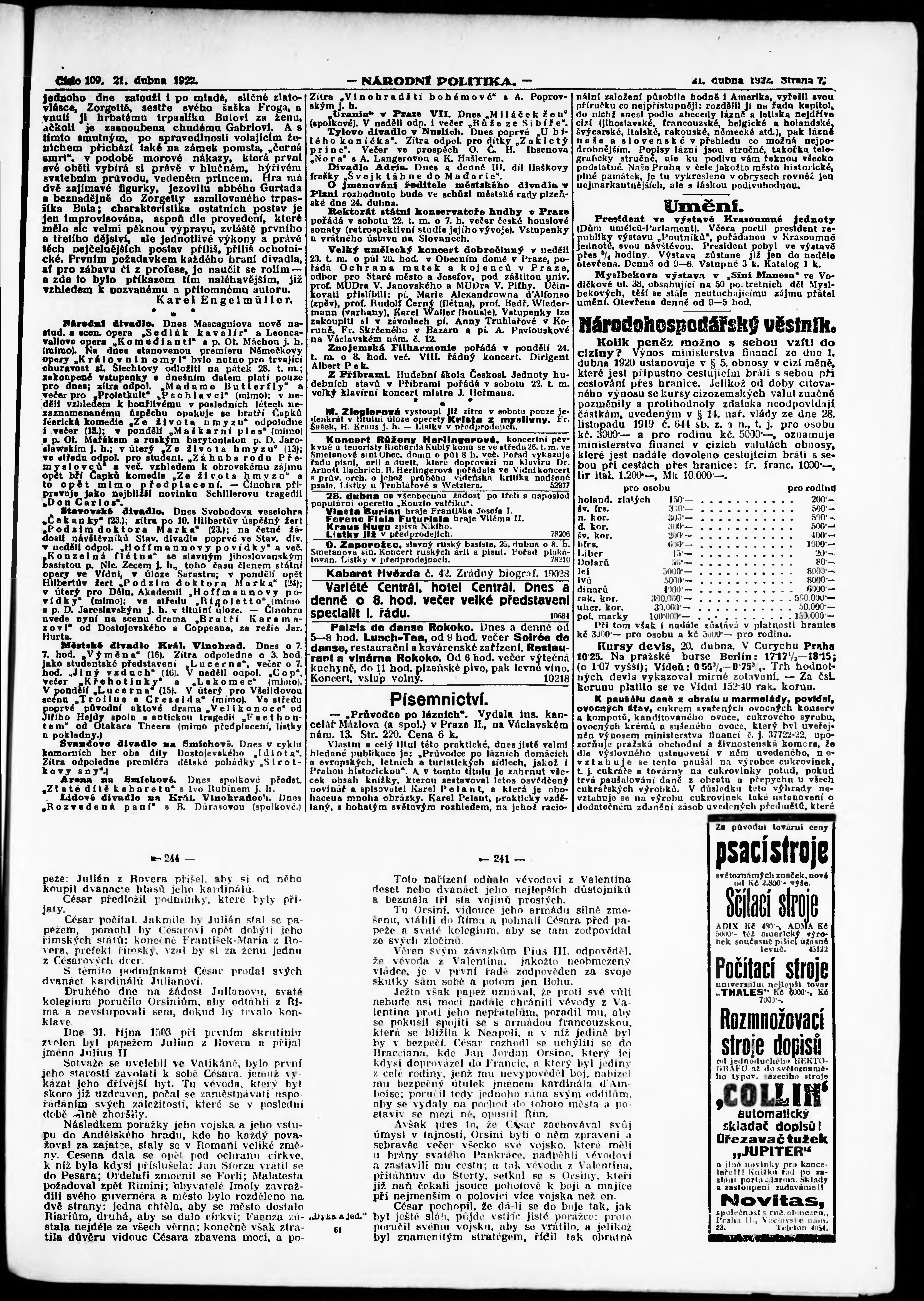 * Datum vydání výtisku: 21.4.1922 Číslo výtisku: 109 Poznámky k výtisku: ranní vydání; vydání pro Prahu;