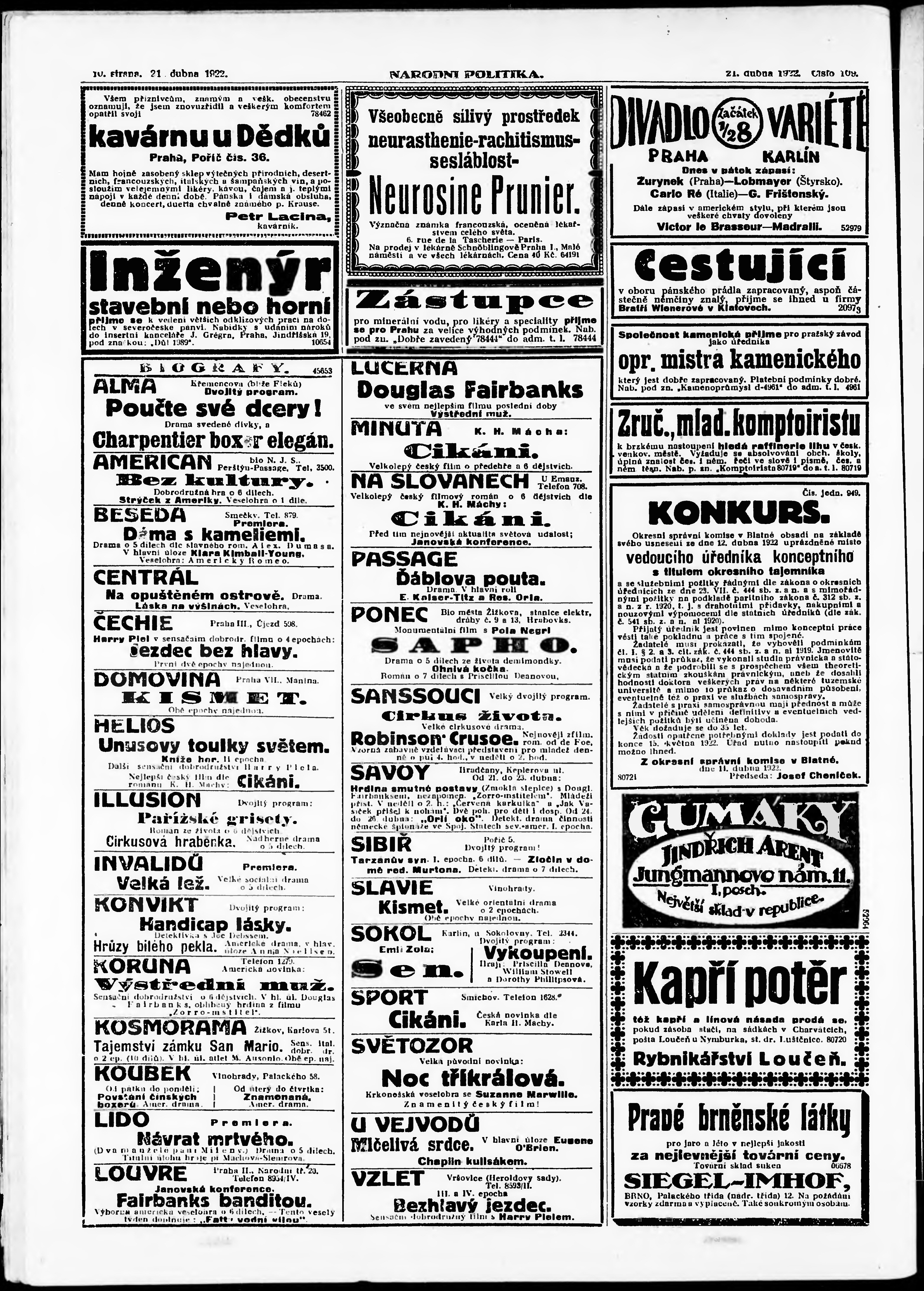 * Datum vydání výtisku: 21.4.1922 Číslo výtisku: 109 Poznámky k výtisku: ranní vydání; vydání pro Prahu;