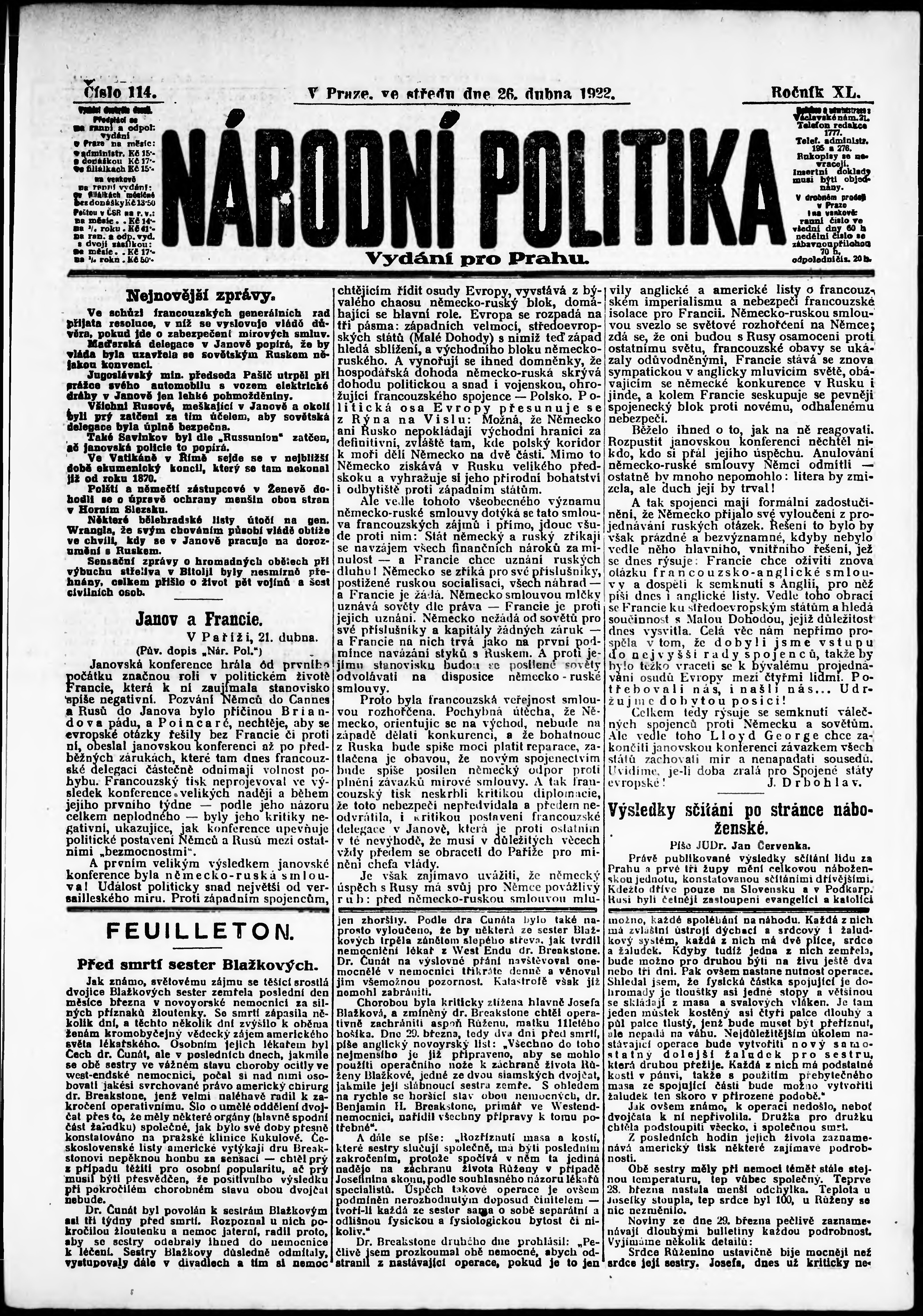 * Datum vydání výtisku: 26.4.1922 Číslo výtisku: 114 Poznámky k výtisku: ranní vydání; vydání pro Prahu;
