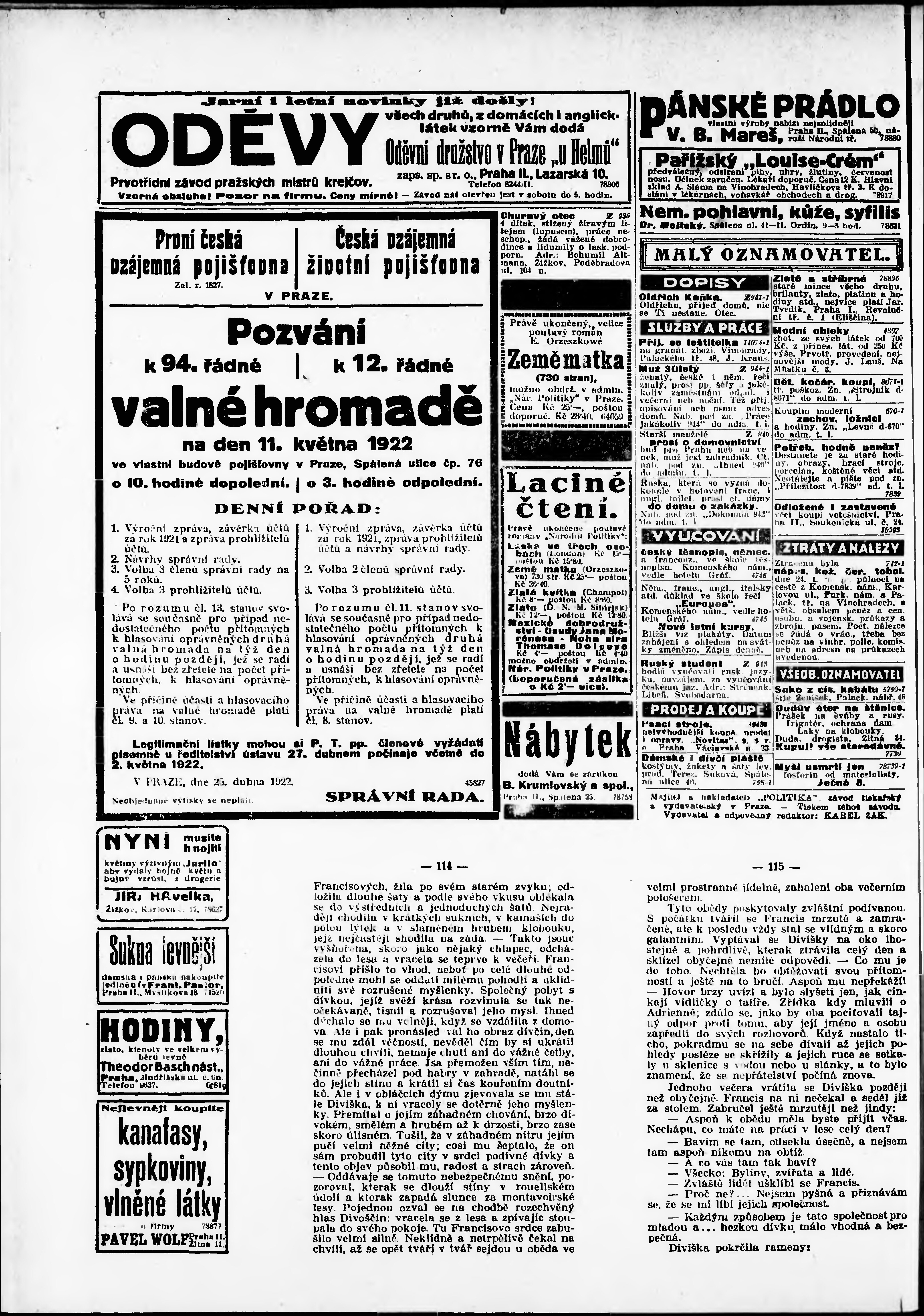 * Datum vydání výtisku: 26.4.1922 Číslo výtisku: 114 Poznámky k výtisku: odpolední vydání;
