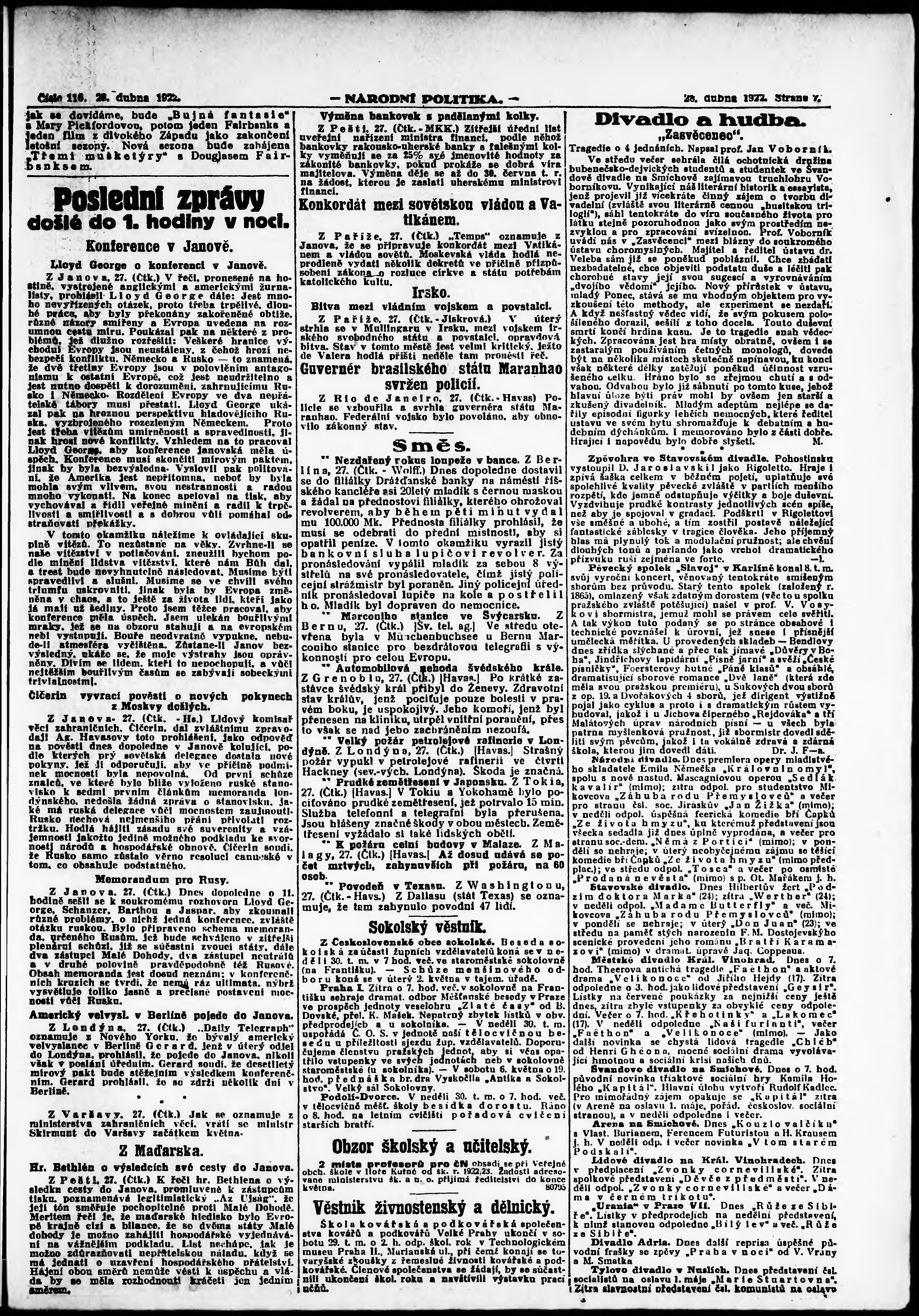 * Datum vydání výtisku: 28.4.1922 Číslo výtisku: 116 Poznámky k výtisku: ranní vydání; vydání pro Prahu;