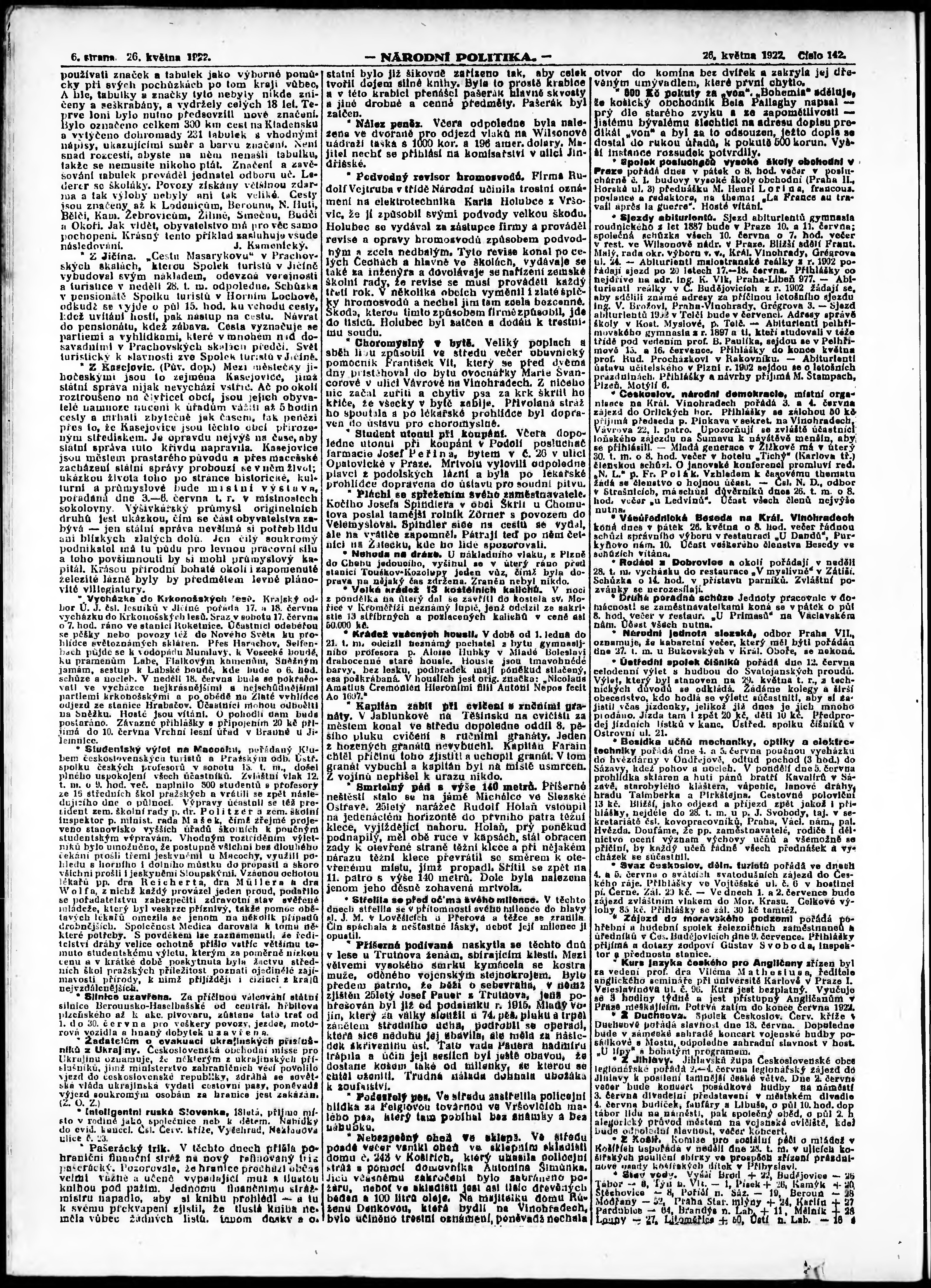 * Datum vydání výtisku: 26.5.1922 Číslo výtisku: 142 Poznámky k výtisku: ranní vydání; vydání pro Prahu;