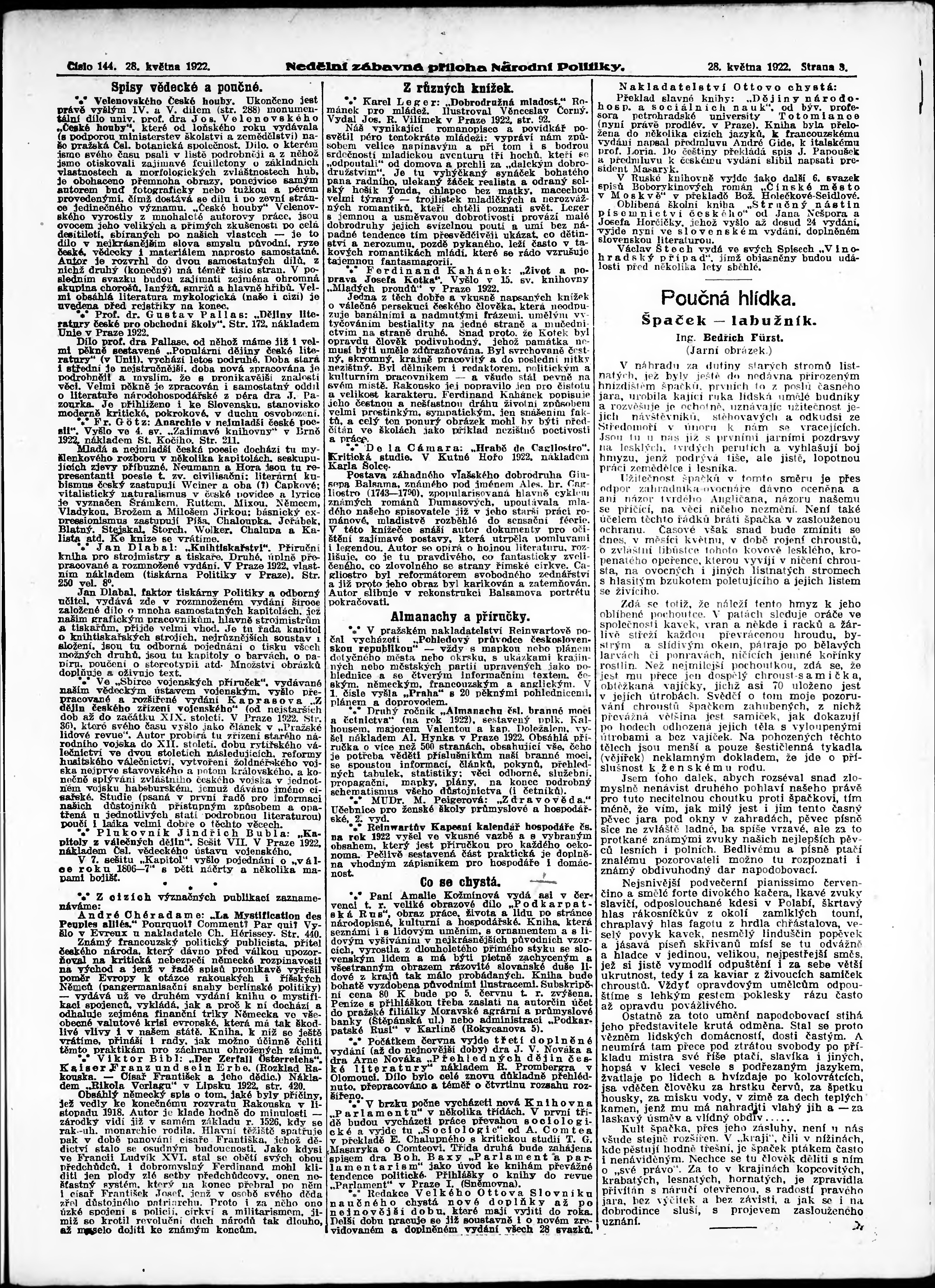 * Datum vydání výtisku: 28.5.1922 Číslo výtisku: 144 Typ výtisku: příloha