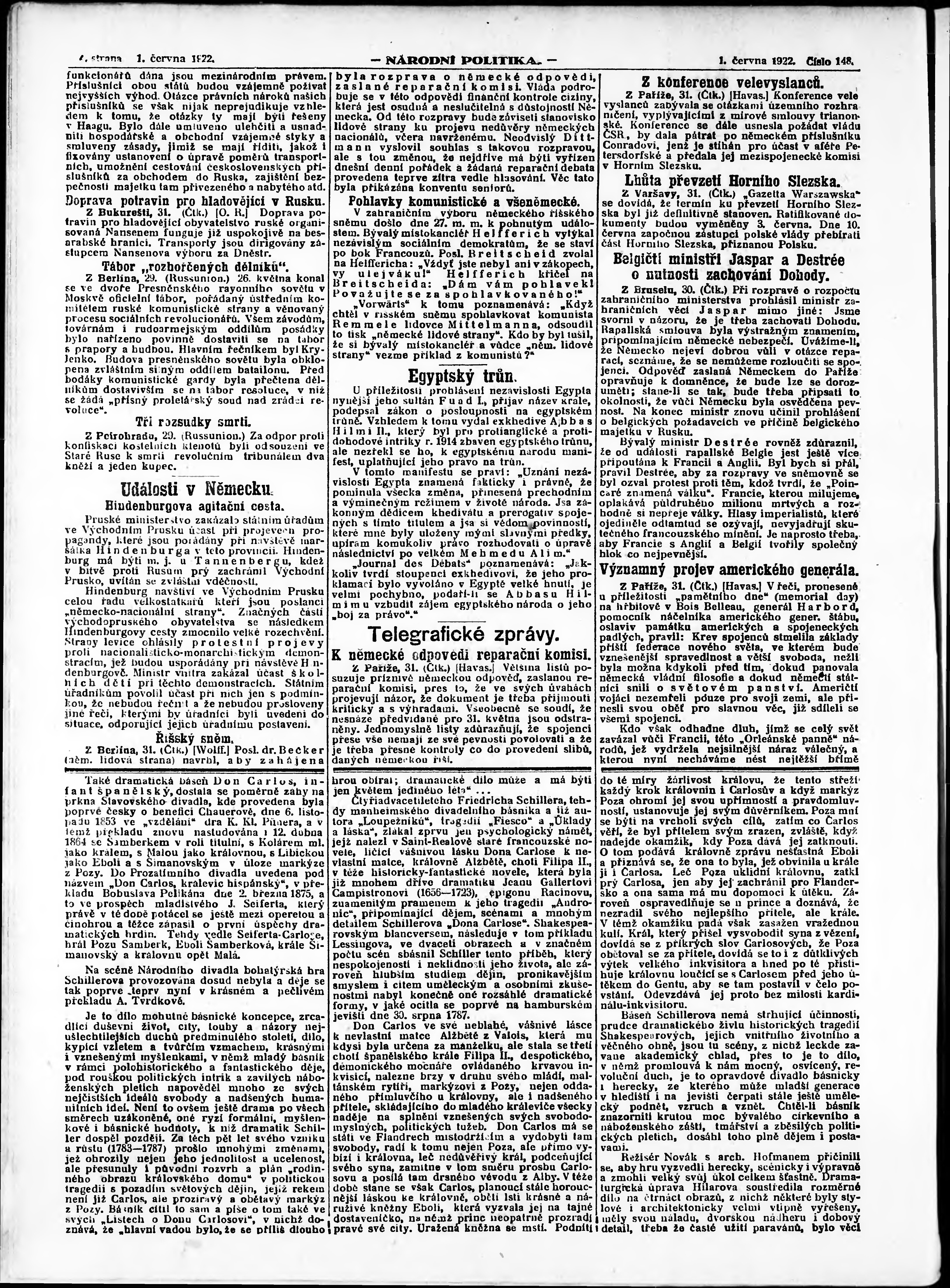 * Datum vydání výtisku: 1.6.1922 Číslo výtisku: 148 Poznámky k výtisku: ranní vydání; vydání pro Prahu;