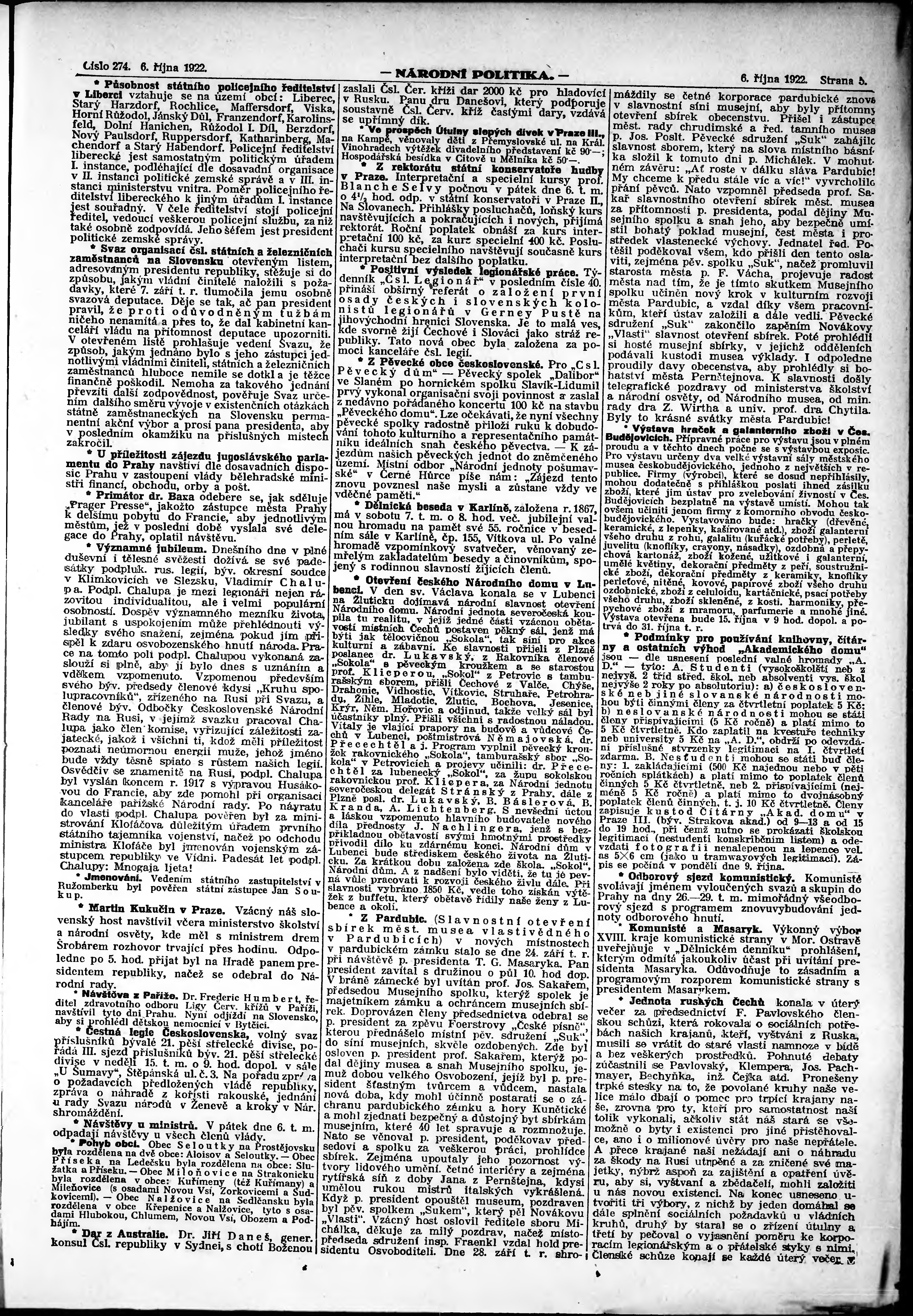 * Datum vydání výtisku: 6.10.1922 Číslo výtisku: 274 Poznámky k výtisku: ranní vydání; vydání pro Prahu;