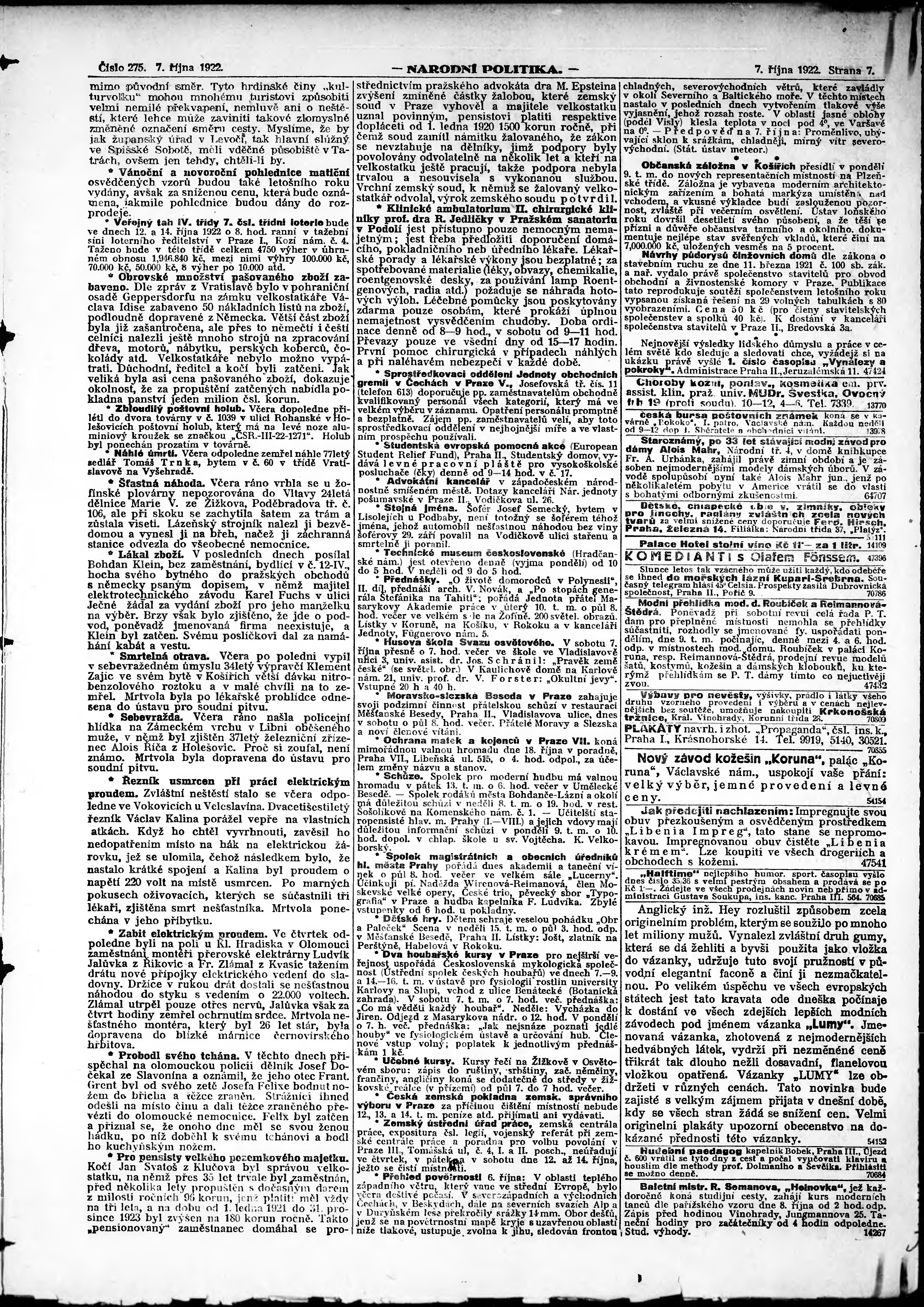* Datum vydání výtisku: 7.10.1922 Číslo výtisku: 275 Poznámky k výtisku: ranní vydání; vydání pro Prahu;