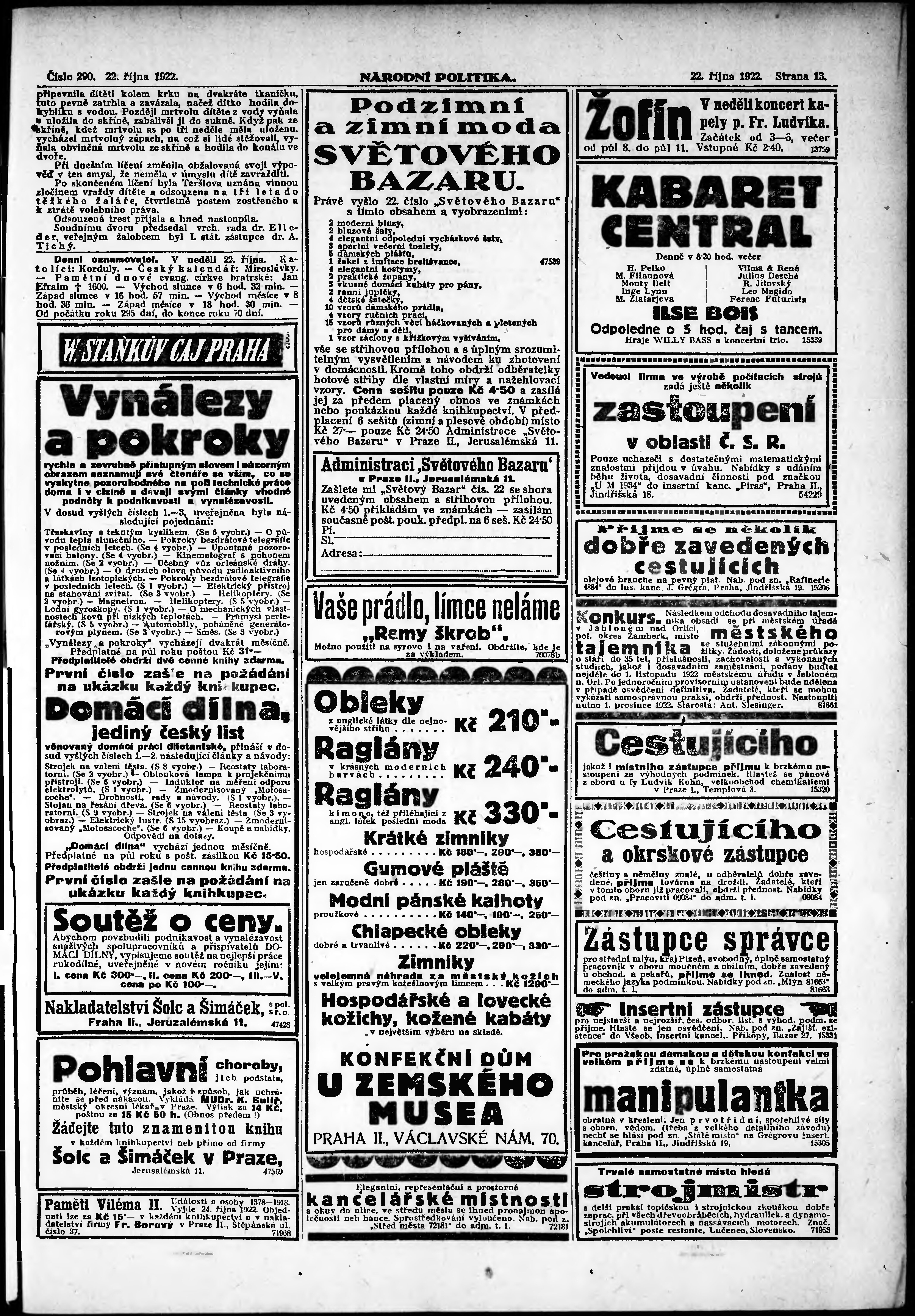 * Datum vydání výtisku: 22.10.1922 Číslo výtisku: 290 Poznámky k výtisku: ranní vydání;