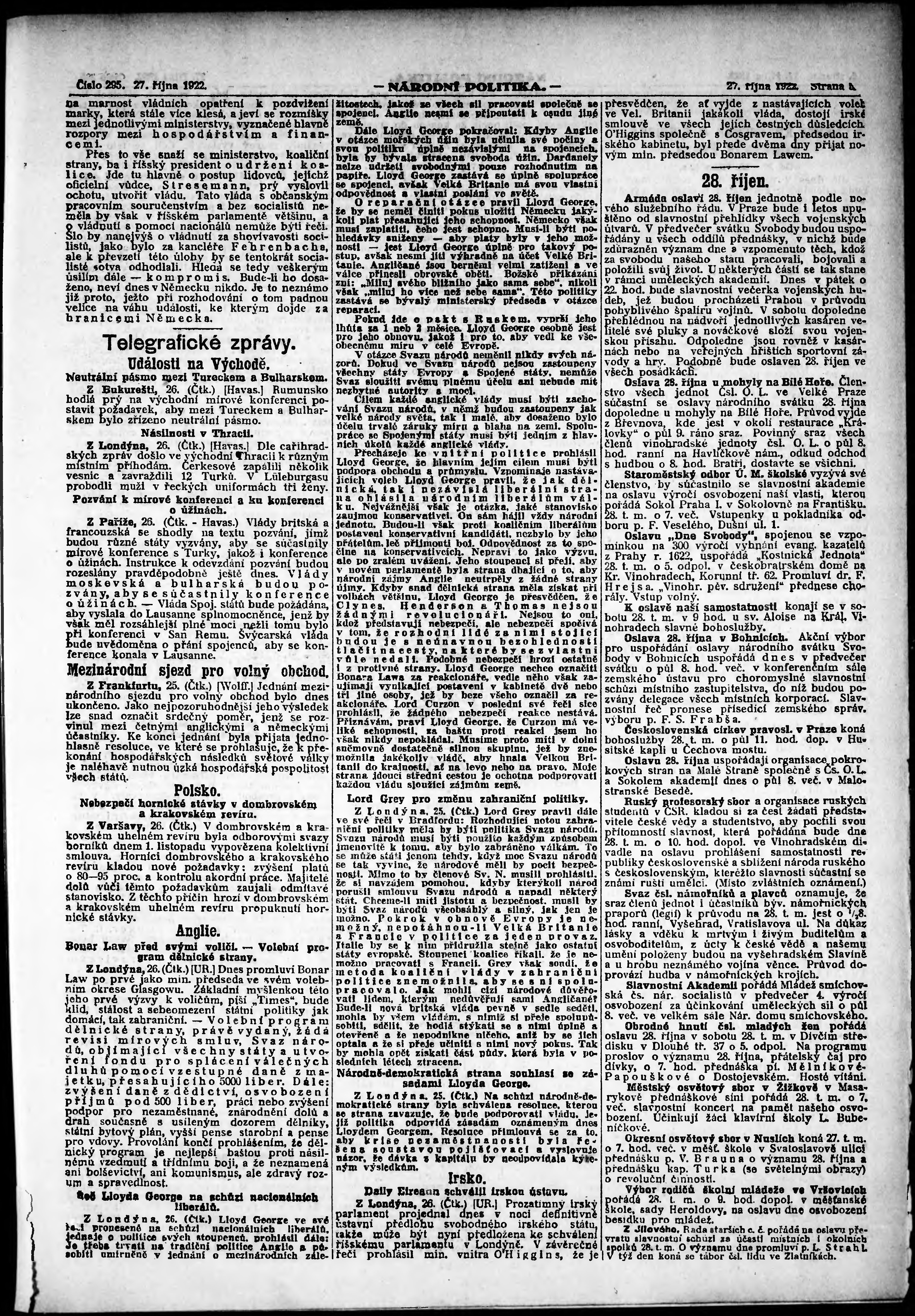 * Datum vydání výtisku: 27.10.1922 Číslo výtisku: 295 Poznámky k výtisku: ranní vydání; vydání pro Prahu;