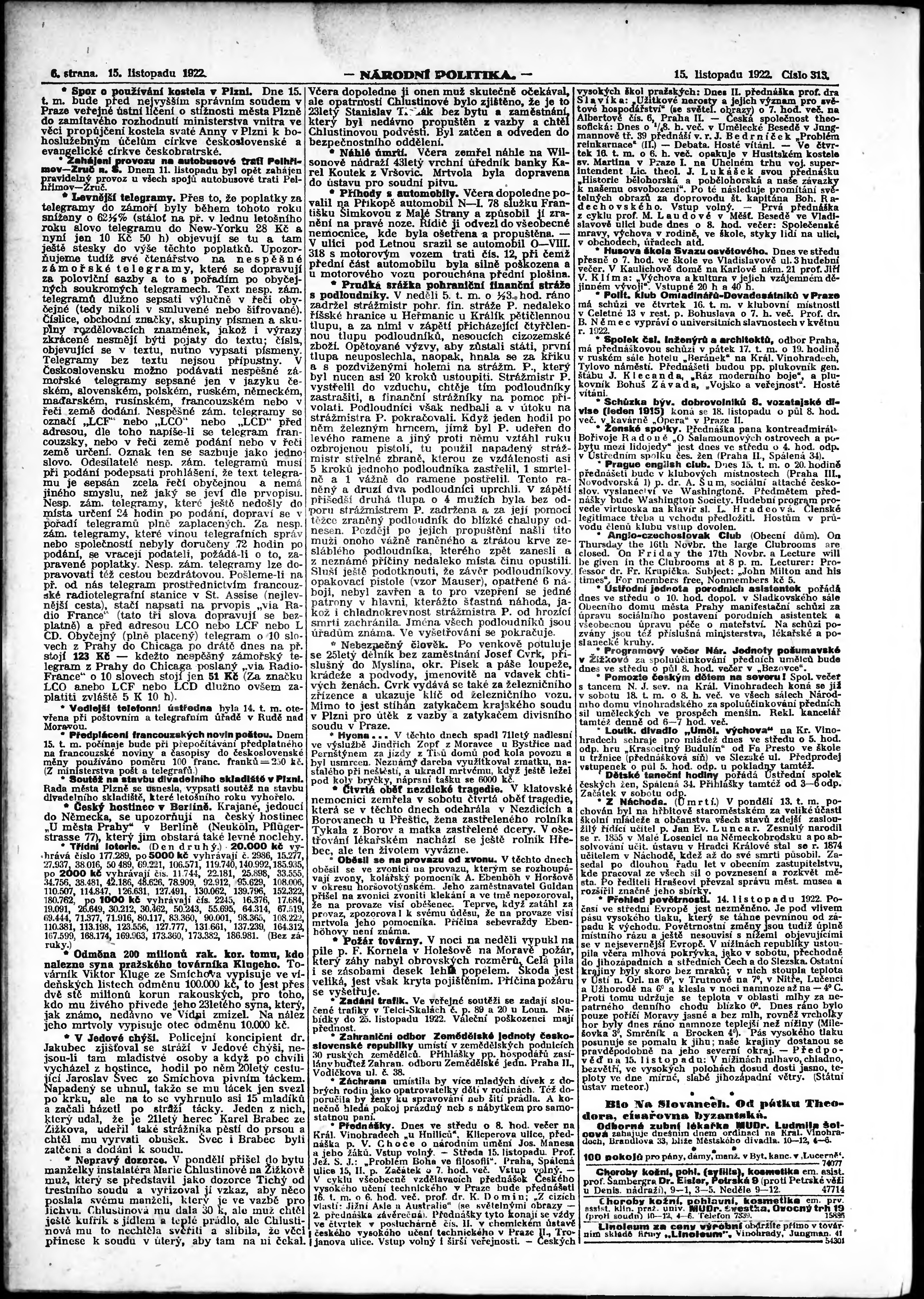 * Datum vydání výtisku: 15.11.1922 Číslo výtisku: 313 Poznámky k výtisku: ranní vydání; vydání pro Prahu;