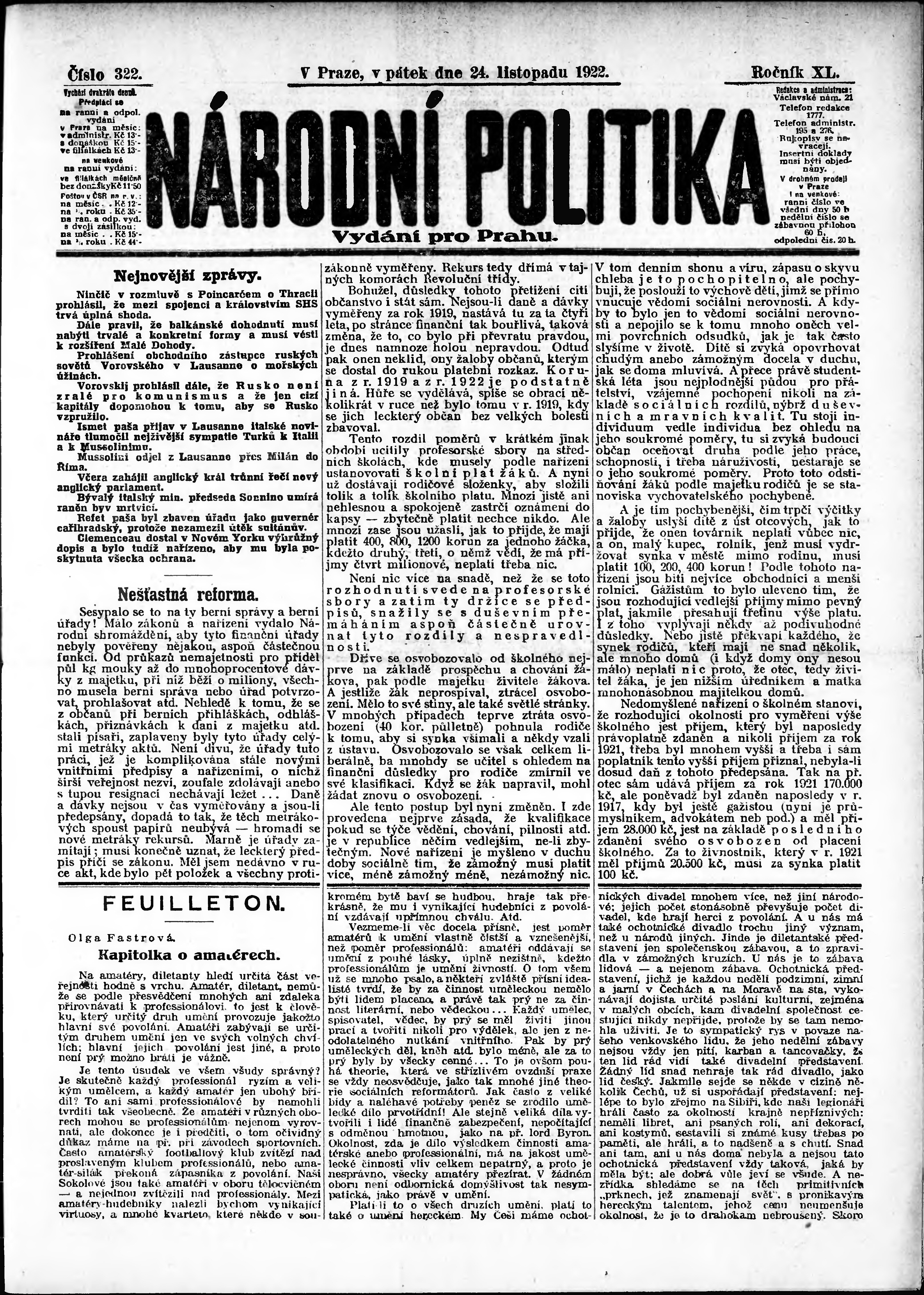 * Datum vydání výtisku: 24.11.1922 Číslo výtisku: 322 Poznámky k výtisku: ranní vydání; vydání pro Prahu;
