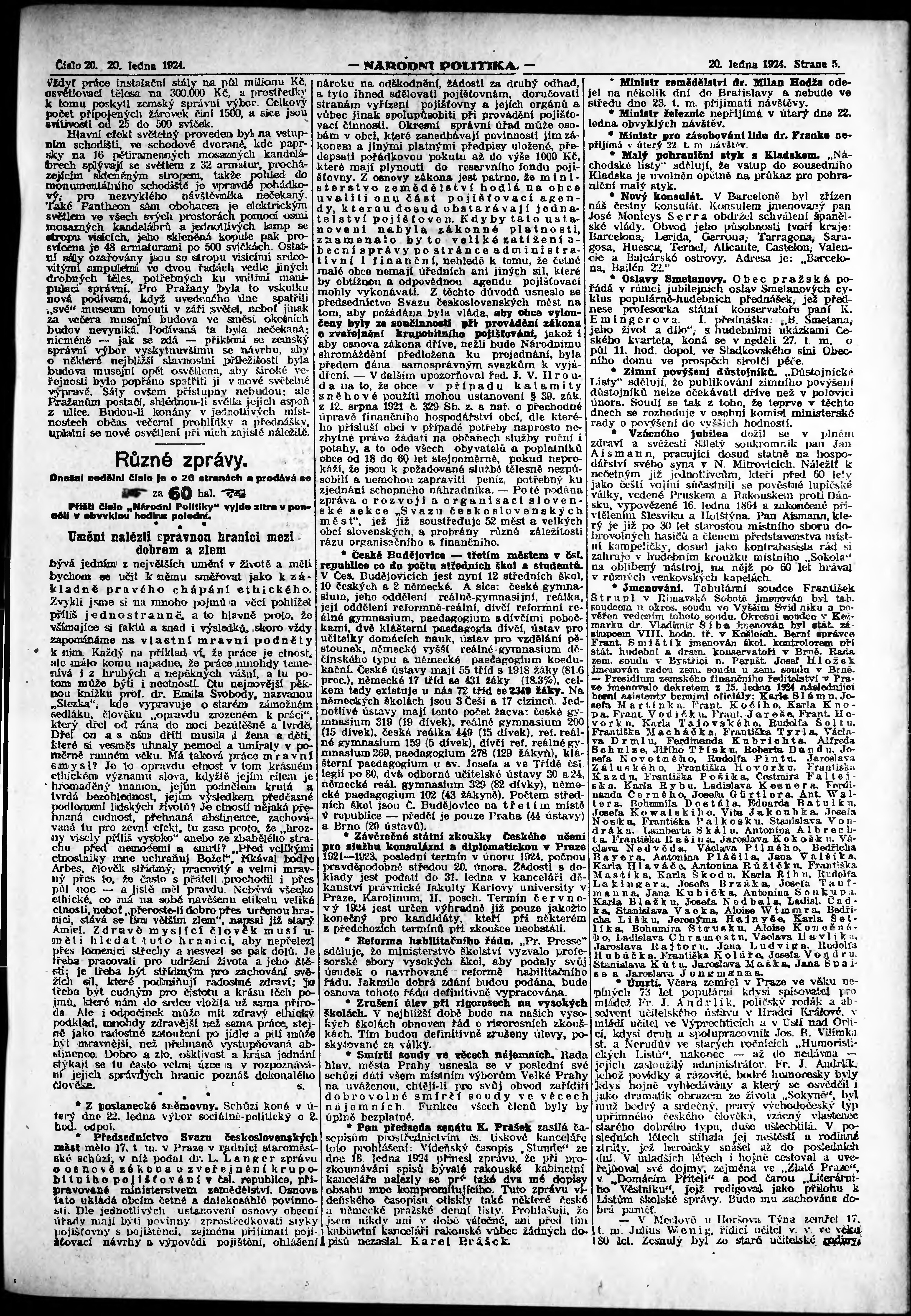* Datum vydání výtisku: 20.1.1924 Číslo výtisku: 20 Poznámky k výtisku: ranní vydání;