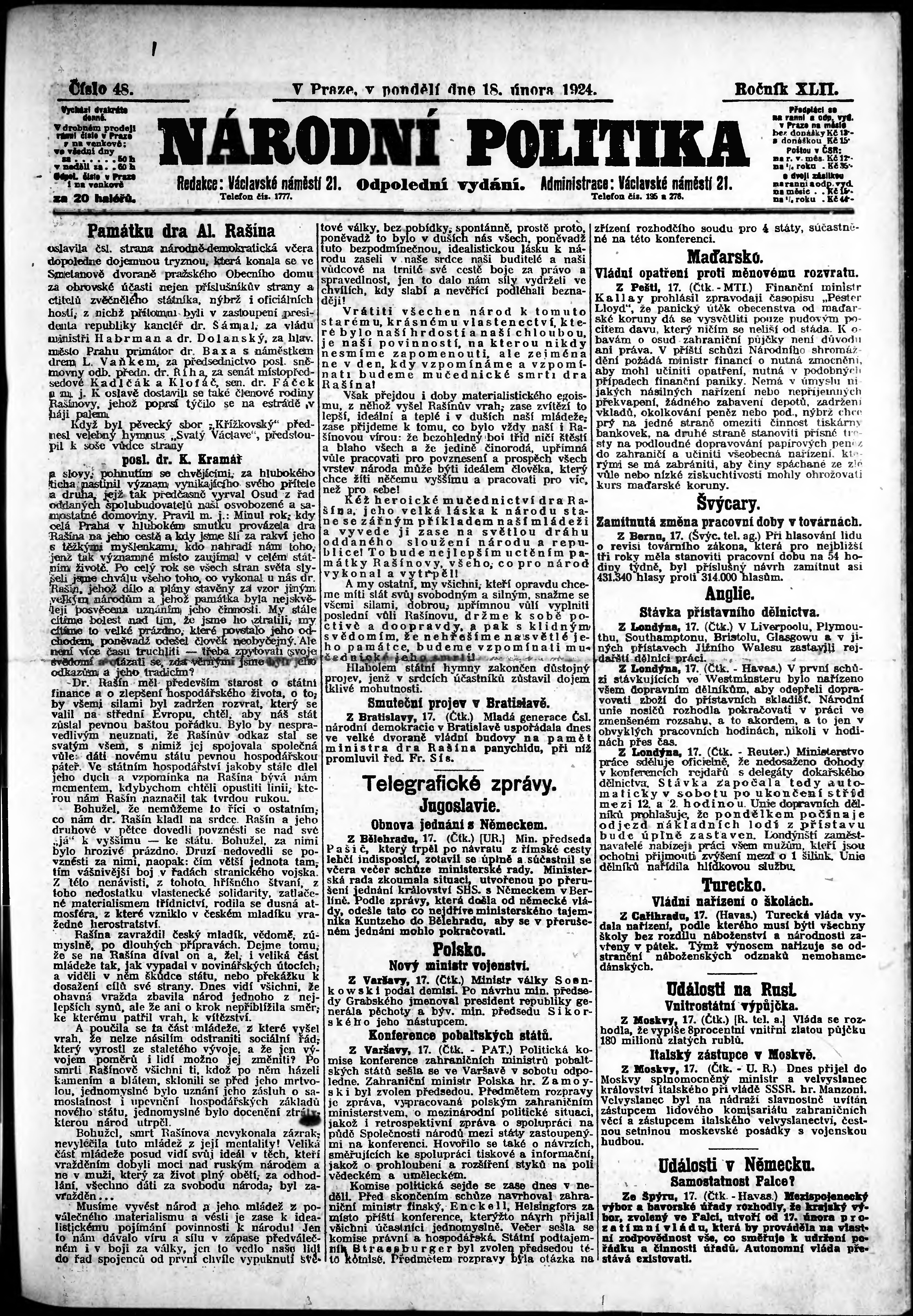 * Datum vydání výtisku: 18.2.1924 Číslo výtisku: 48 Poznámky k výtisku: odpolední vydání;