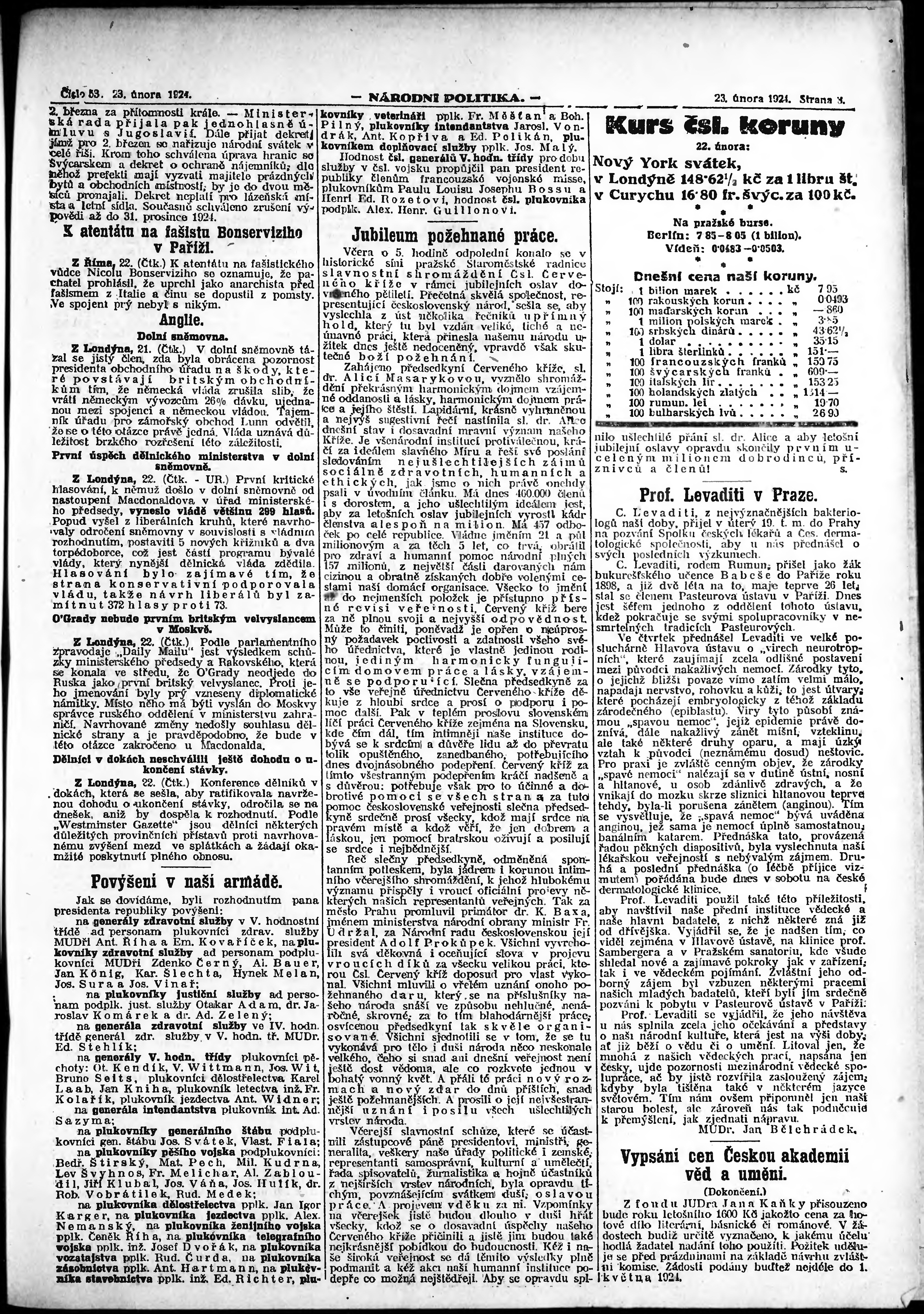 * Datum vydání výtisku: 23.2.1924 Číslo výtisku: 53 Poznámky k výtisku: ranní vydání; vydání pro Prahu;
