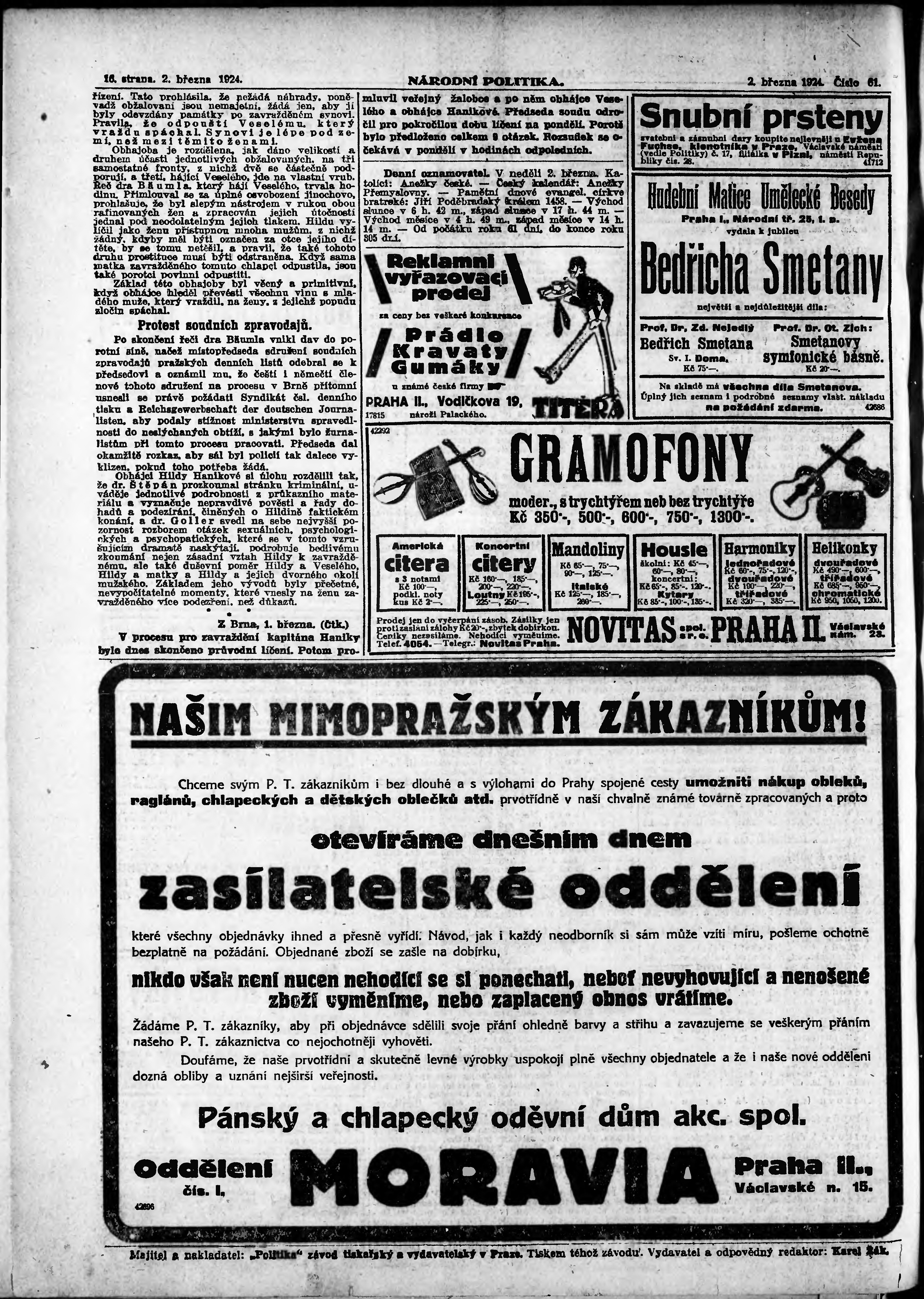 * Datum vydání výtisku: 2.3.1924 Číslo výtisku: 61 Poznámky k výtisku: ranní vydání;