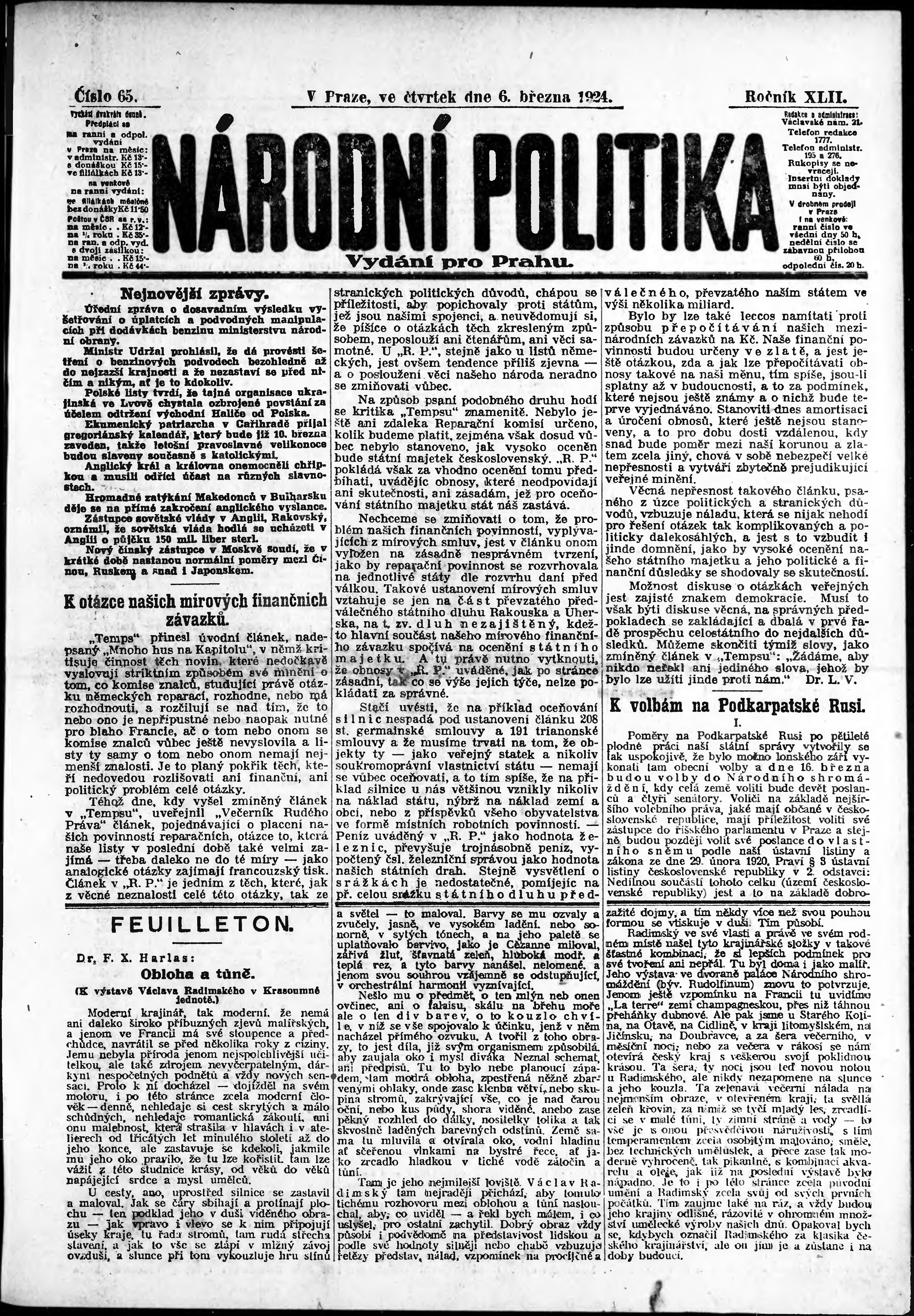 * Datum vydání výtisku: 6.3.1924 Číslo výtisku: 65 Poznámky k výtisku: ranní vydání; vydání pro Prahu;