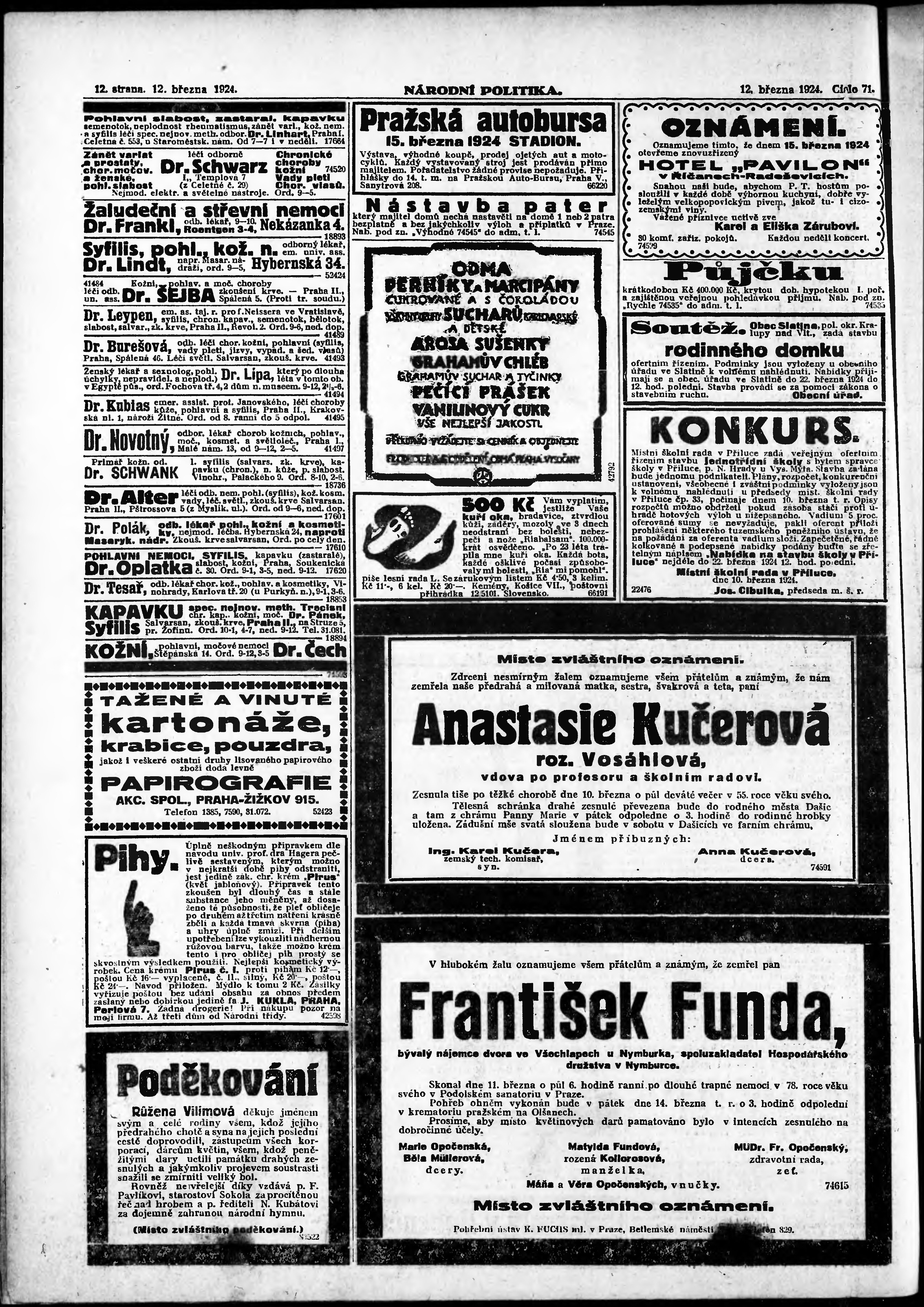 * Datum vydání výtisku: 12.3.1924 Číslo výtisku: 71 Poznámky k výtisku: ranní vydání; vydání pro Prahu;