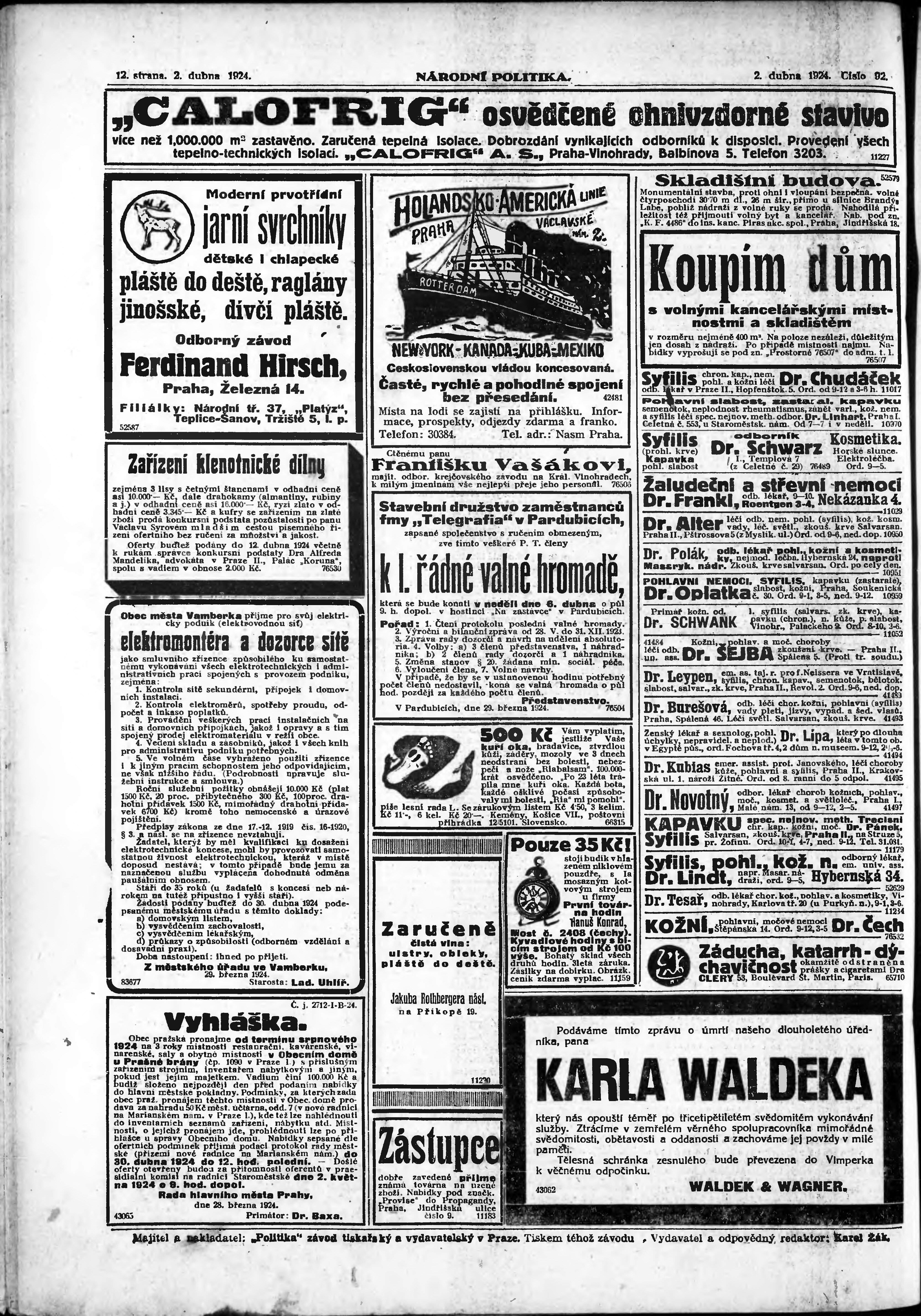 * Datum vydání výtisku: 2.4.1924 Číslo výtisku: 92 Poznámky k výtisku: ranní vydání; vydání pro Prahu;