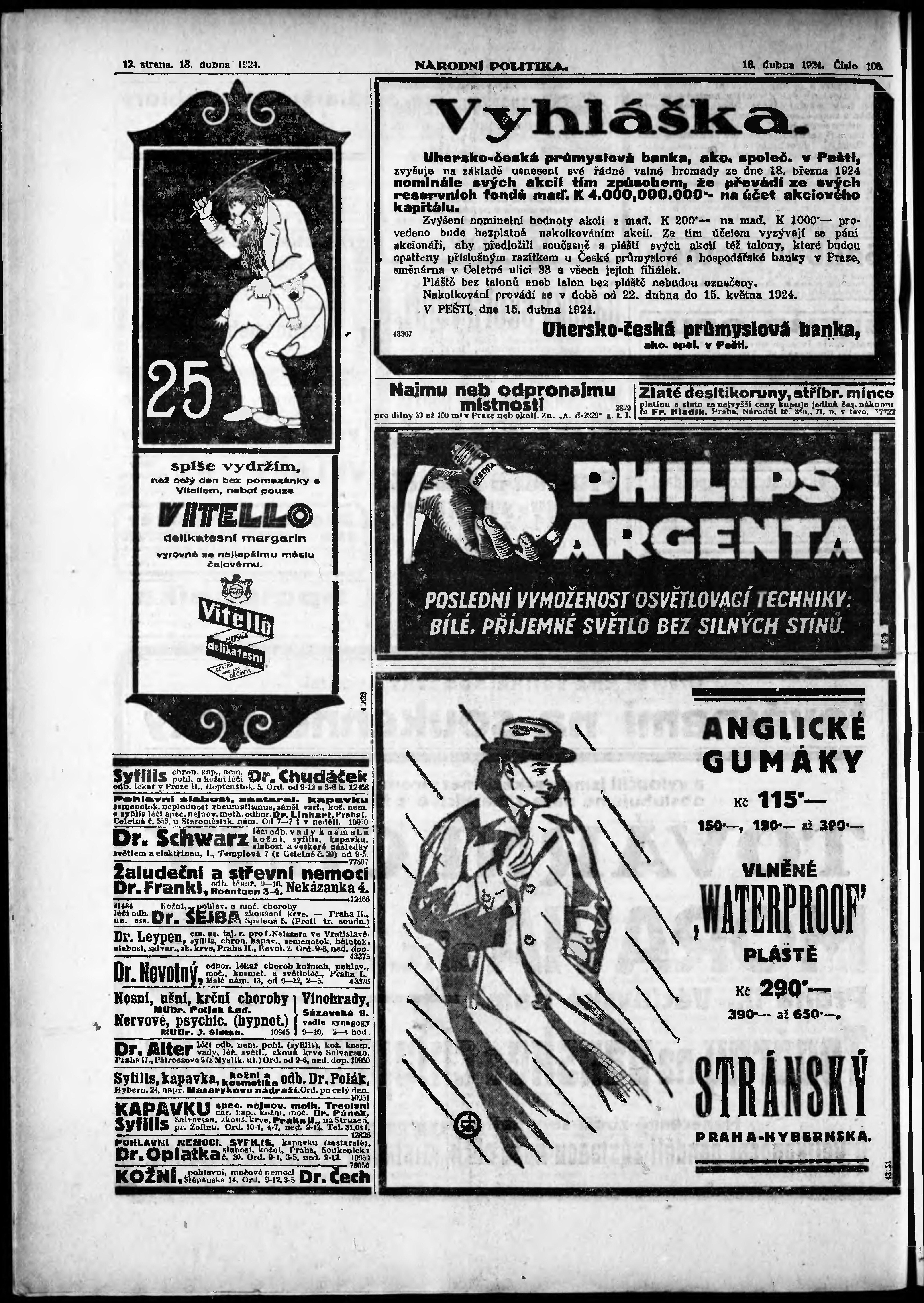 * Datum vydání výtisku: 18.4.1924 Číslo výtisku: 108 Poznámky k výtisku: ranní vydání; vydání pro Prahu;
