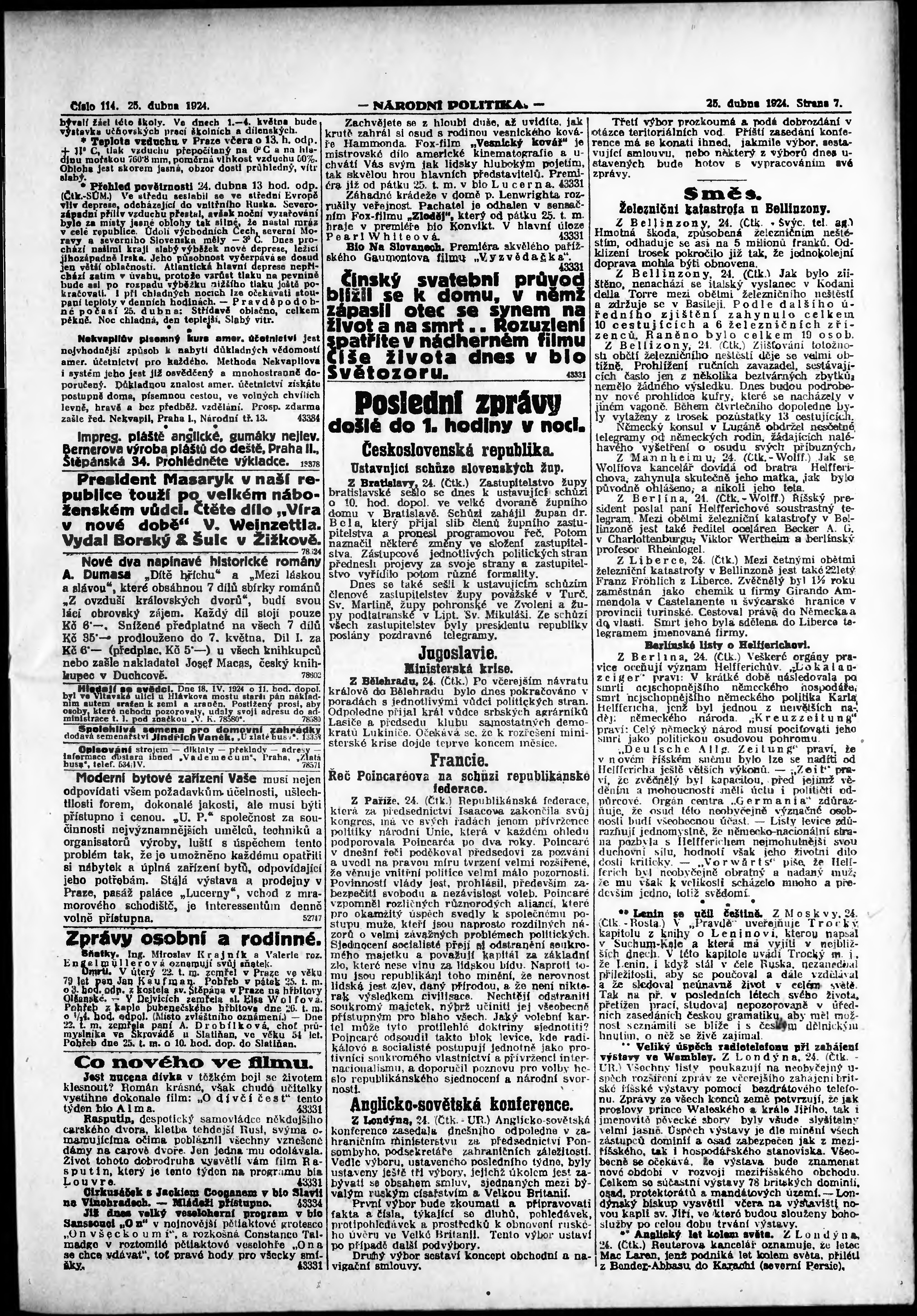 * Datum vydání výtisku: 25.4.1924 Číslo výtisku: 114 Poznámky k výtisku: ranní vydání; vydání pro Prahu;