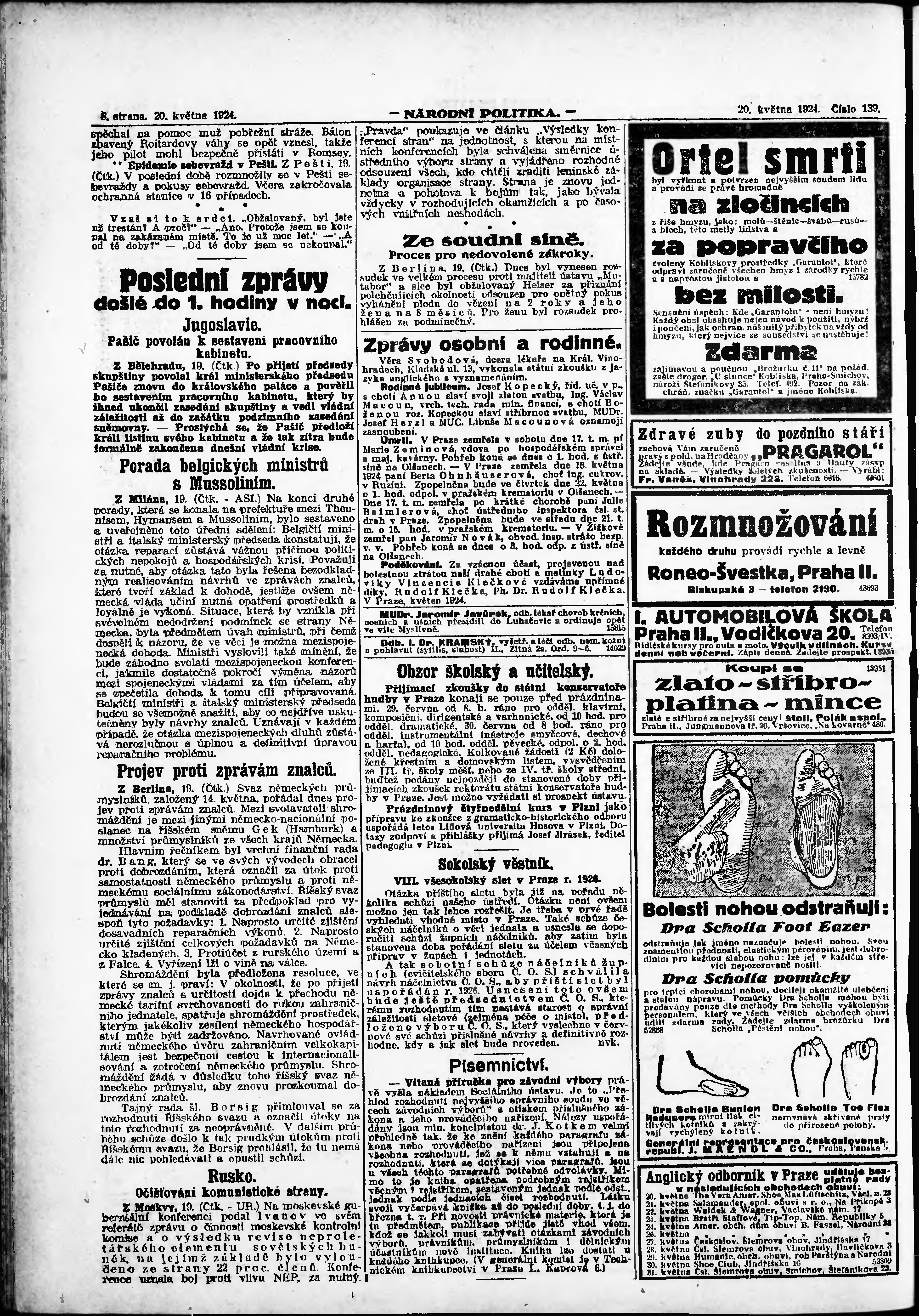 * Datum vydání výtisku: 20.5.1924 Číslo výtisku: 139 Poznámky k výtisku: ranní vydání; vydání pro Prahu;