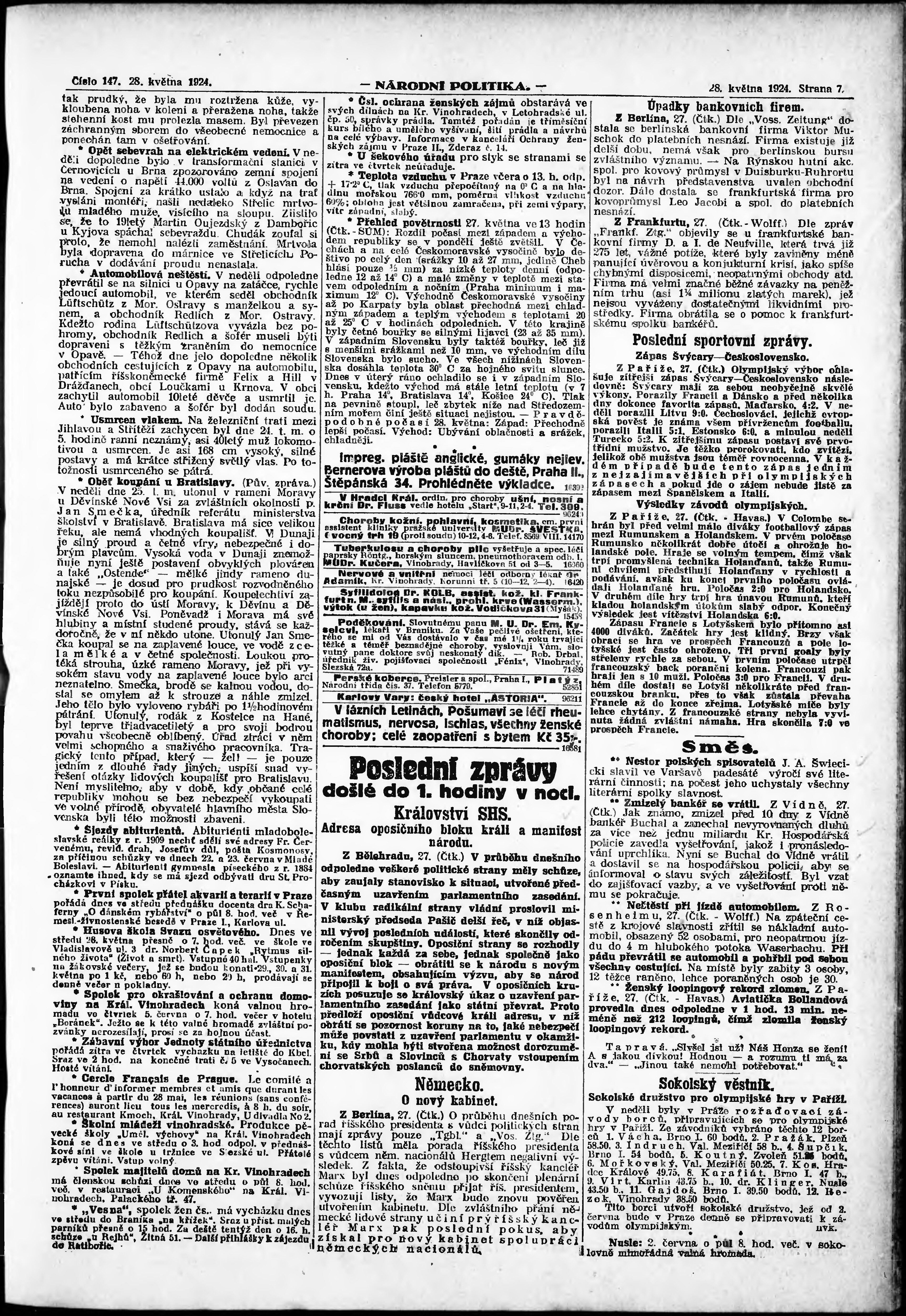 * Datum vydání výtisku: 28.5.1924 Číslo výtisku: 147 Poznámky k výtisku: ranní vydání; vydání pro Prahu;