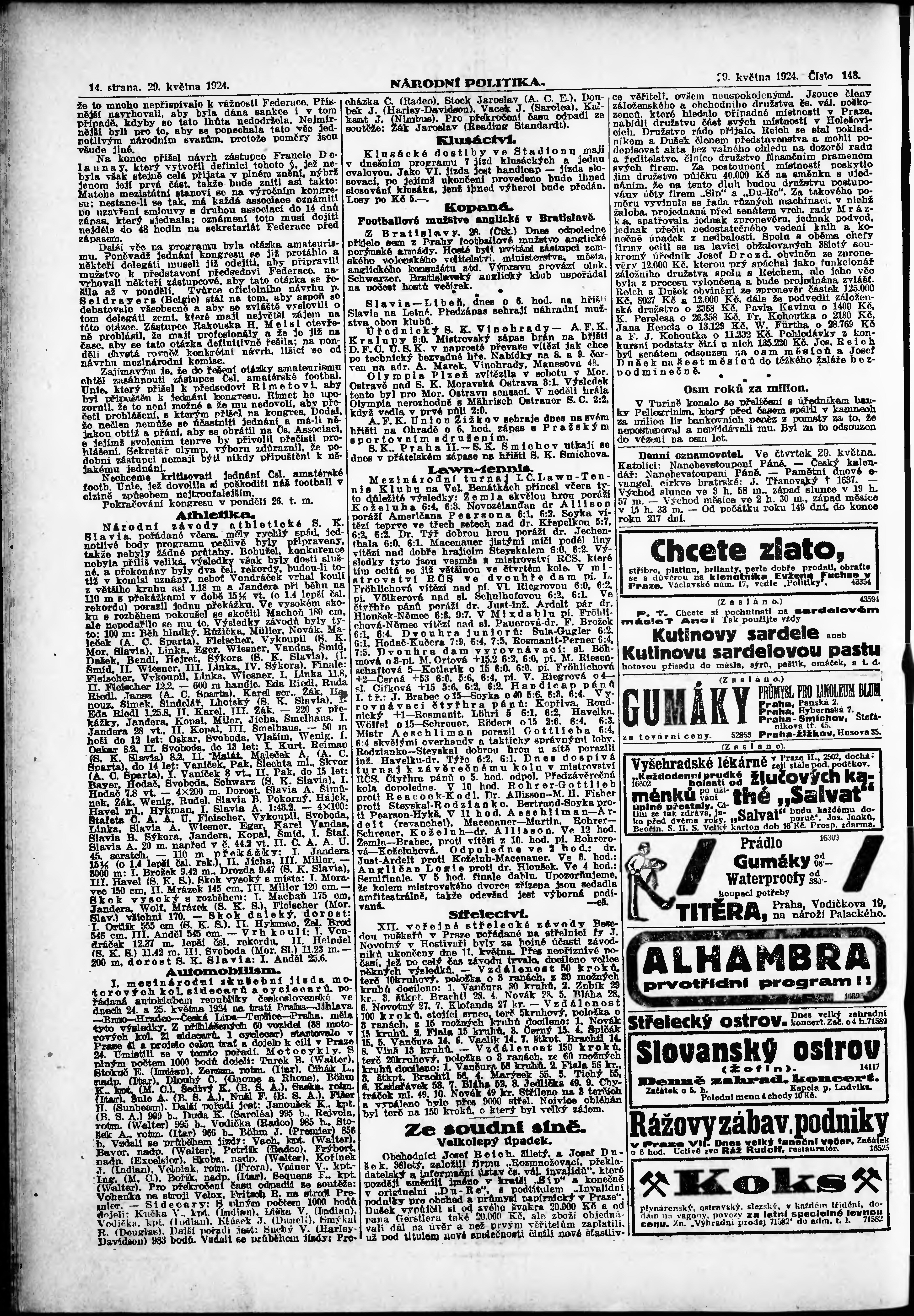 * Datum vydání výtisku: 29.5.1924 Číslo výtisku: 148 Poznámky k výtisku: ranní vydání;