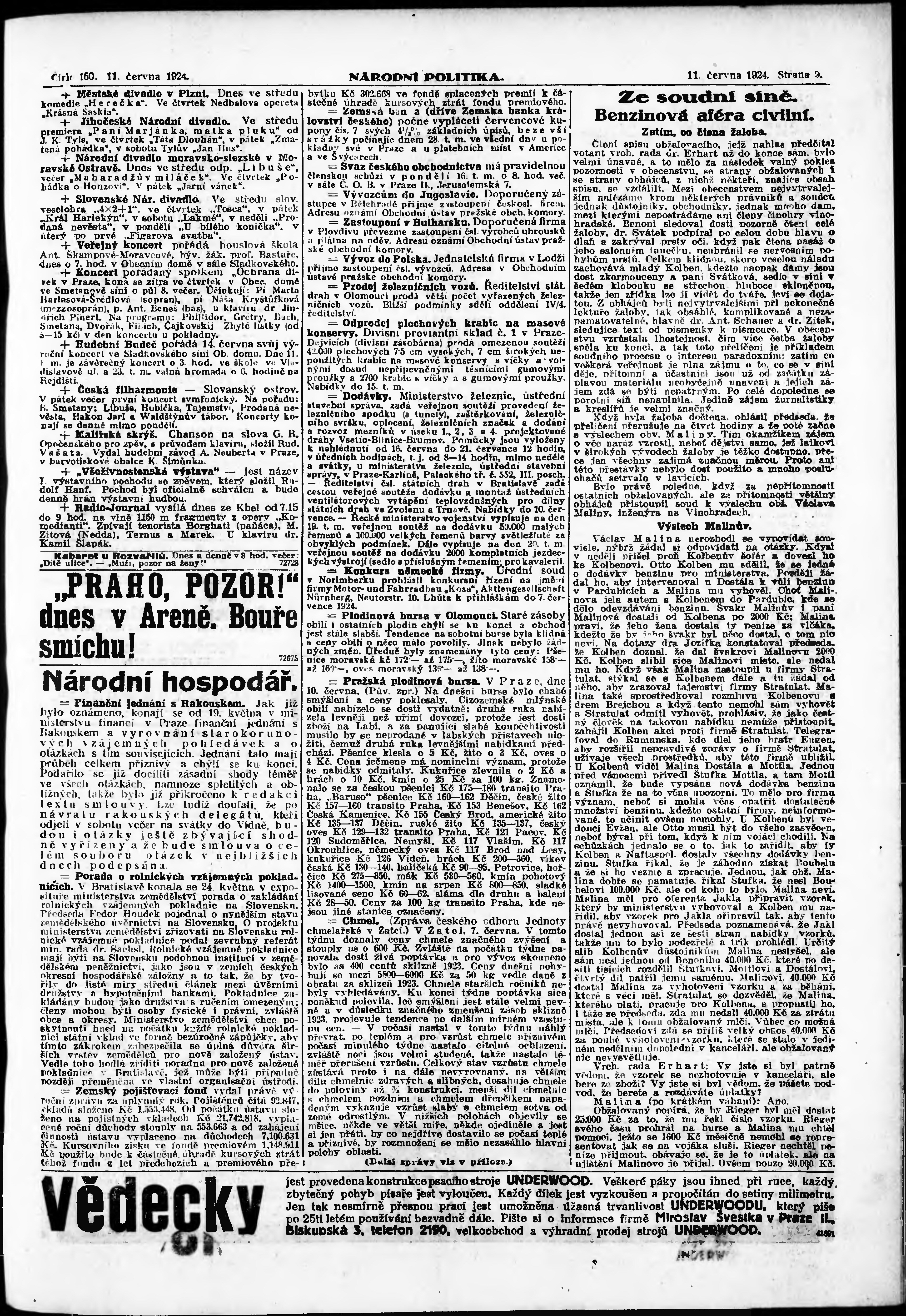 * Datum vydání výtisku: 11.6.1924 Číslo výtisku: 160 Poznámky k výtisku: ranní vydání; vydání pro Prahu;