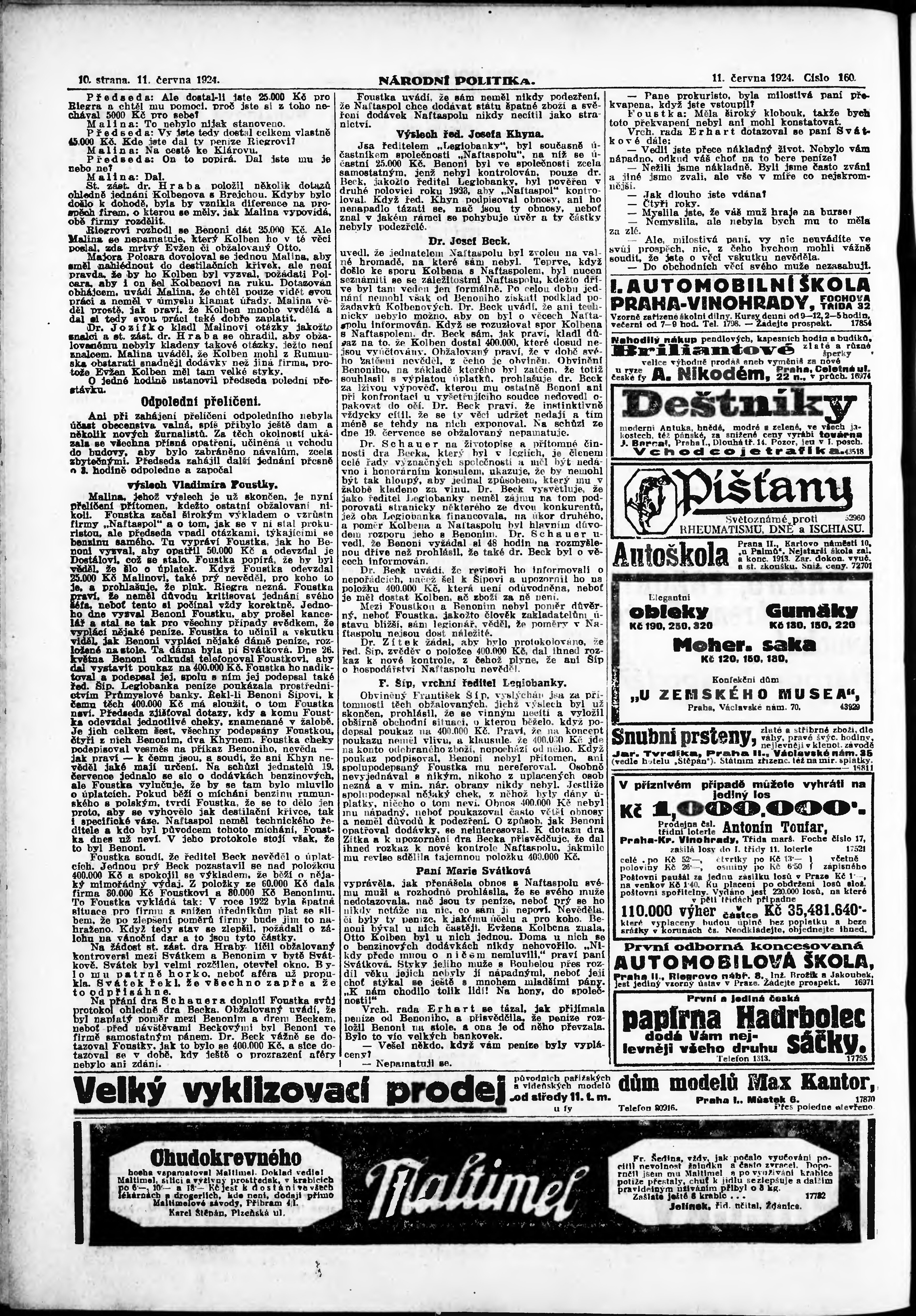 * Datum vydání výtisku: 11.6.1924 Číslo výtisku: 160 Poznámky k výtisku: ranní vydání; vydání pro Prahu;