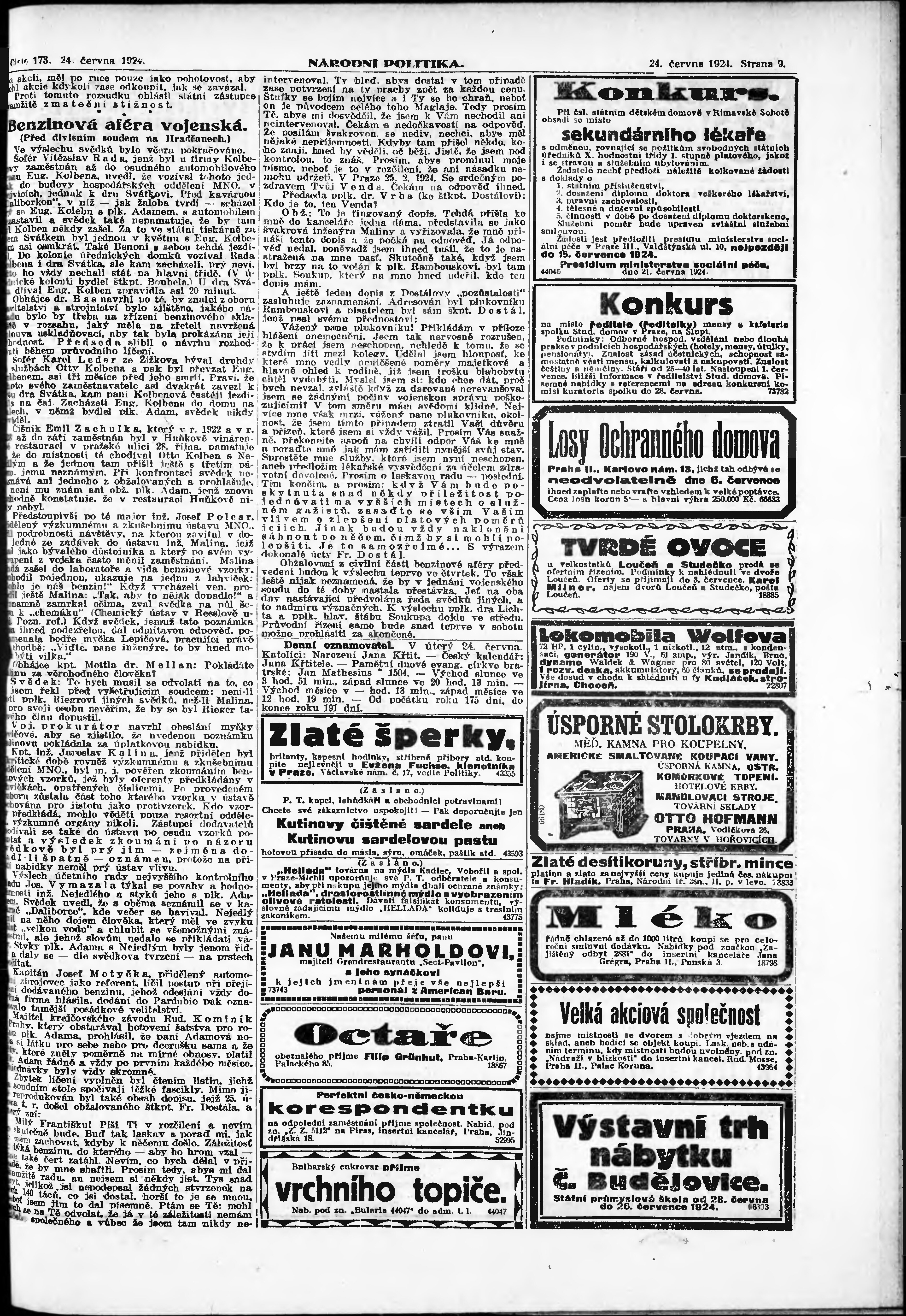 * Datum vydání výtisku: 24.6.1924 Číslo výtisku: 173 Poznámky k výtisku: ranní vydání; vydání pro Prahu;