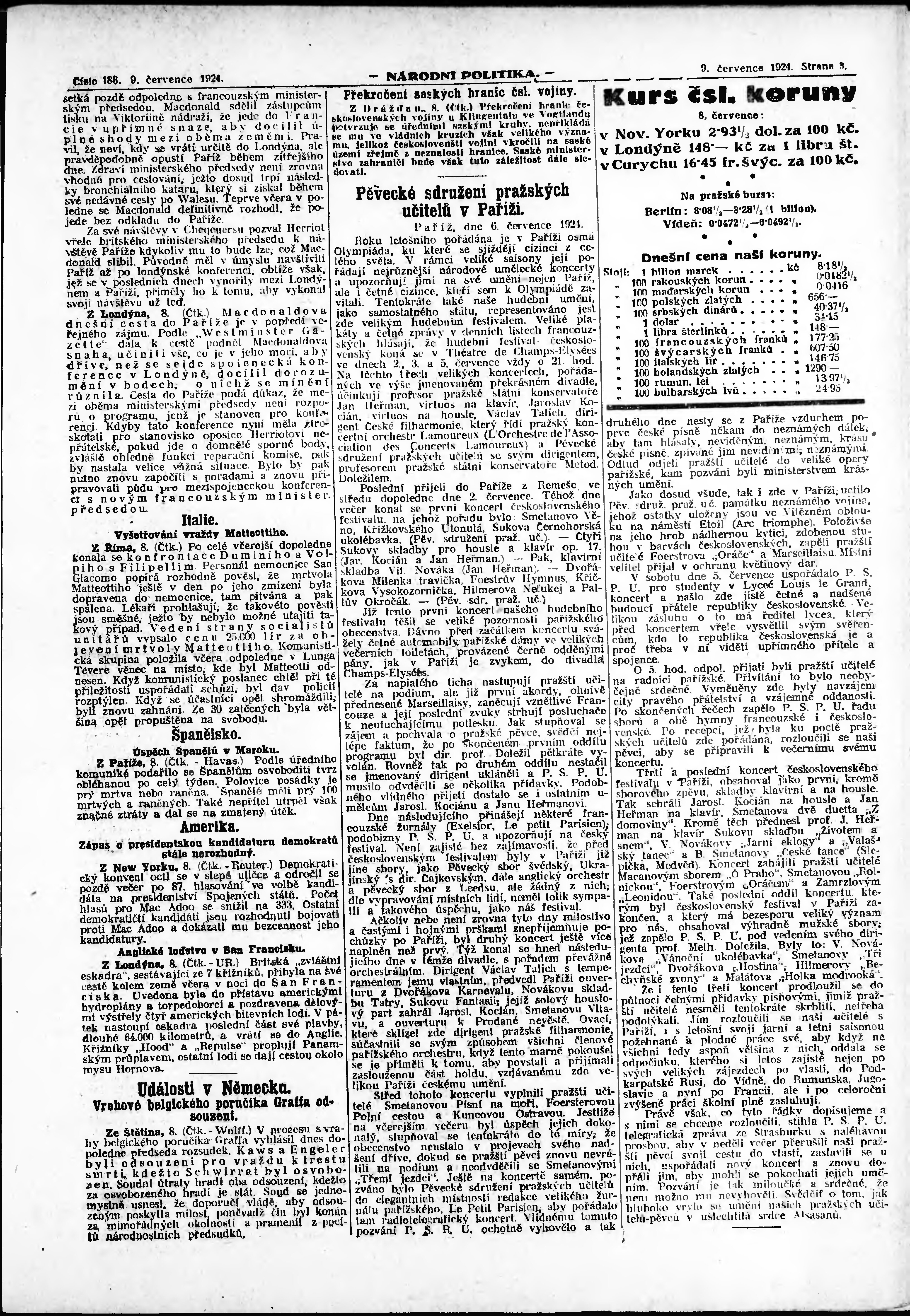 * Datum vydání výtisku: 9.7.1924 Číslo výtisku: 188 Poznámky k výtisku: ranní vydání; vydání pro Prahu;