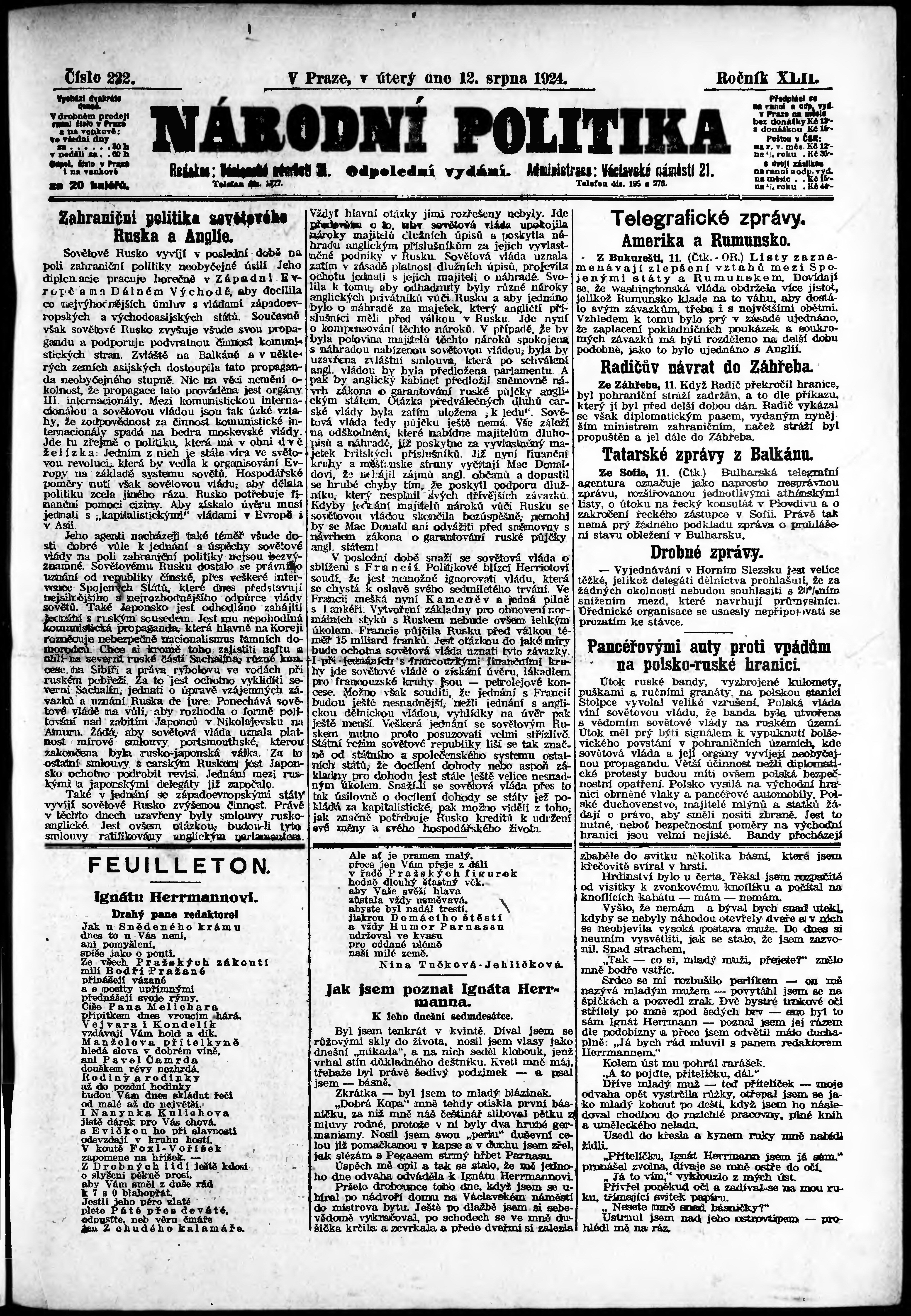 * Datum vydání výtisku: 12.8.1924 Číslo výtisku: 222 Poznámky k výtisku: odpolední vydání;