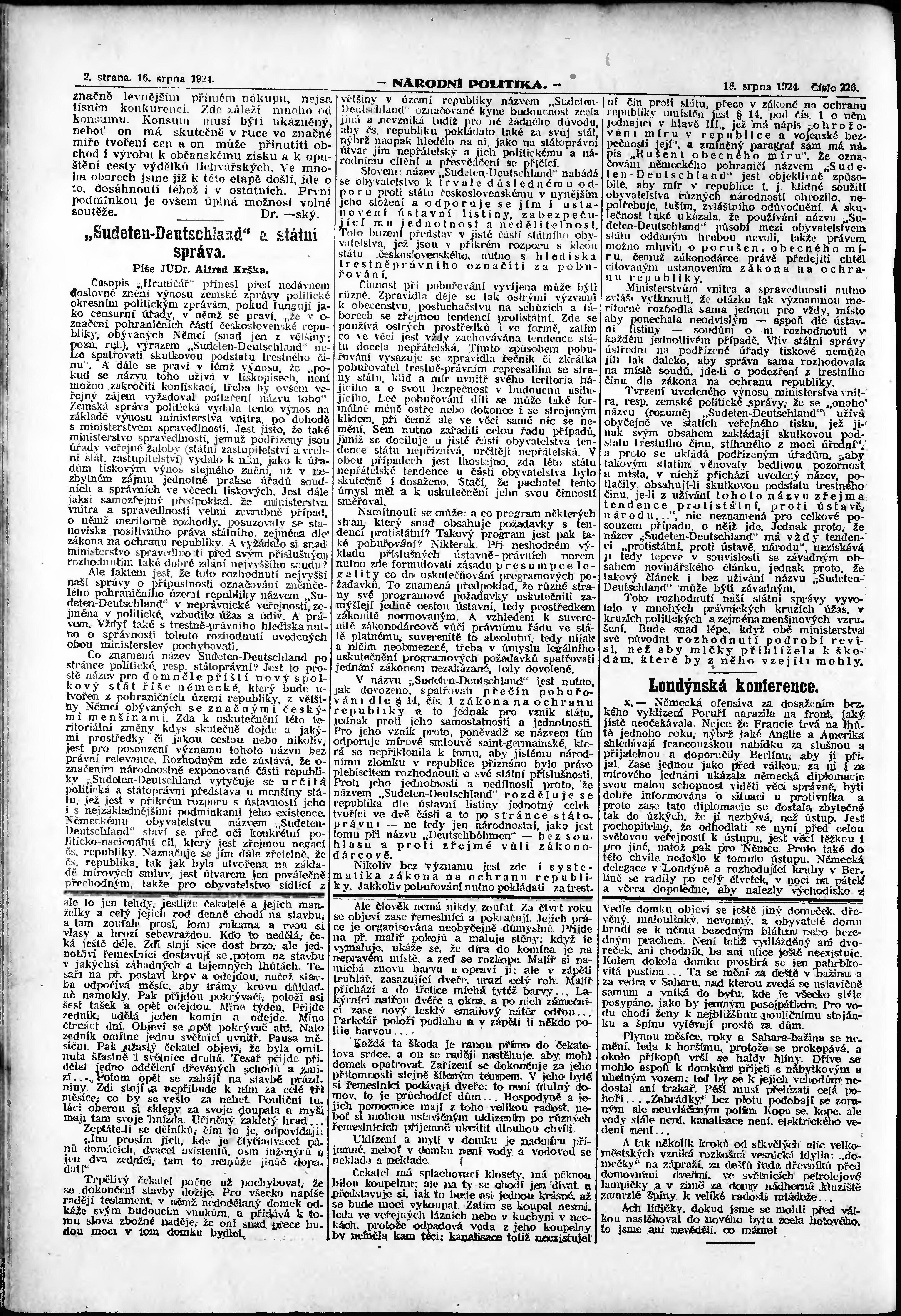 * Datum vydání výtisku: 16.8.1924 Číslo výtisku: 226 Poznámky k výtisku: ranní vydání; vydání pro Prahu;
