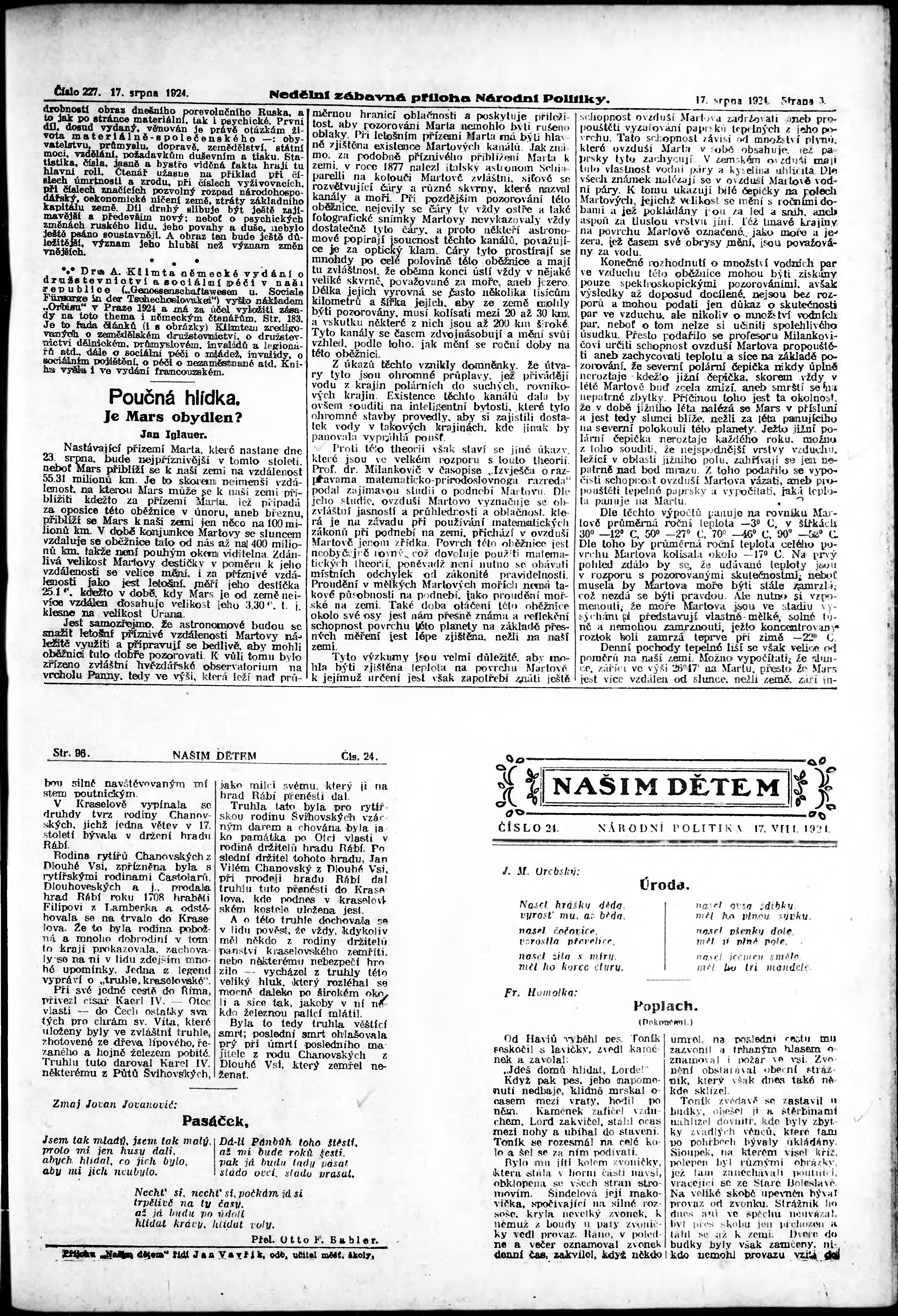 * Datum vydání výtisku: 17.8.1924 Číslo výtisku: 227 Typ výtisku: příloha