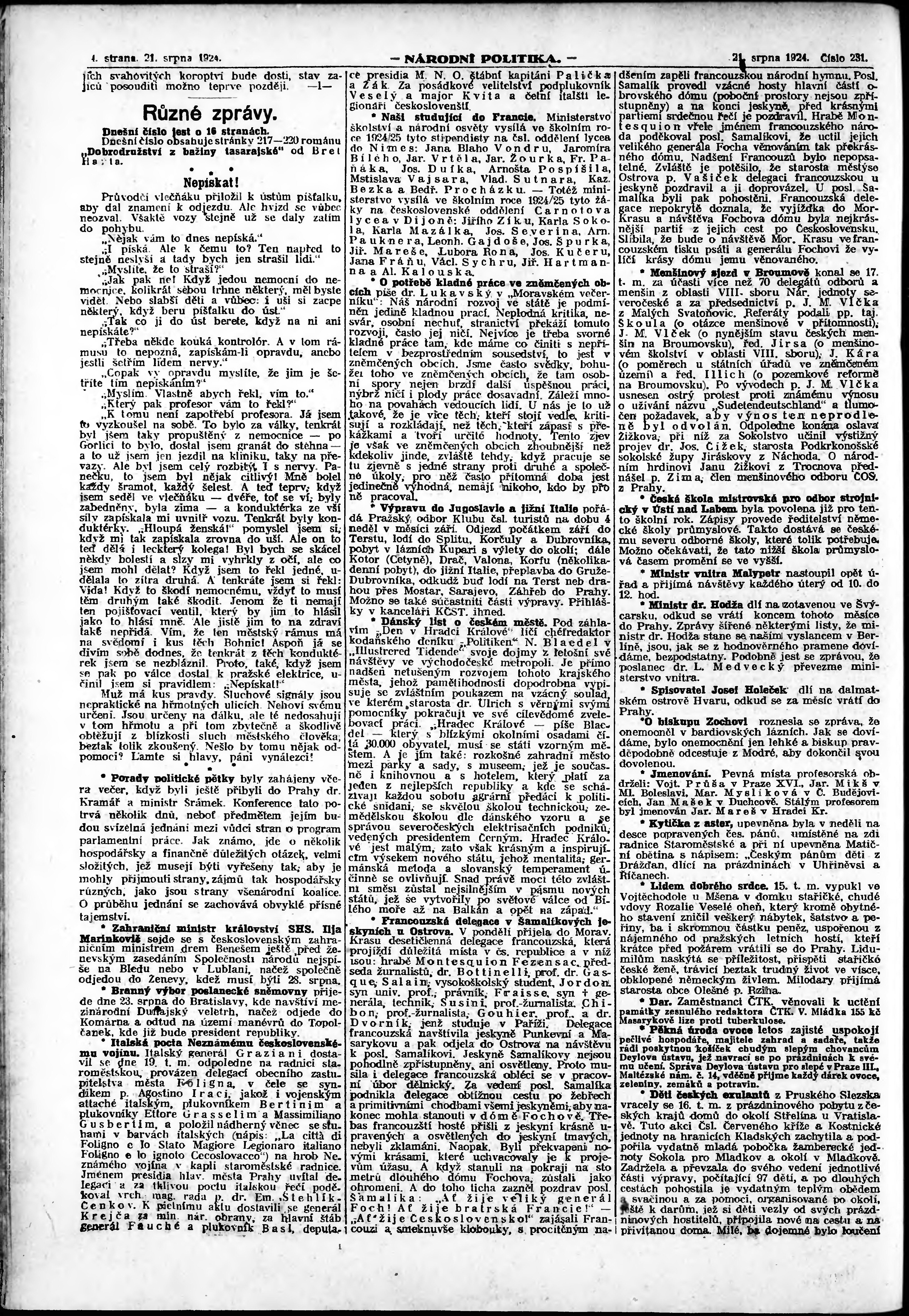 * Datum vydání výtisku: 21.8.1924 Číslo výtisku: 231 Poznámky k výtisku: ranní vydání; vydání pro Prahu;