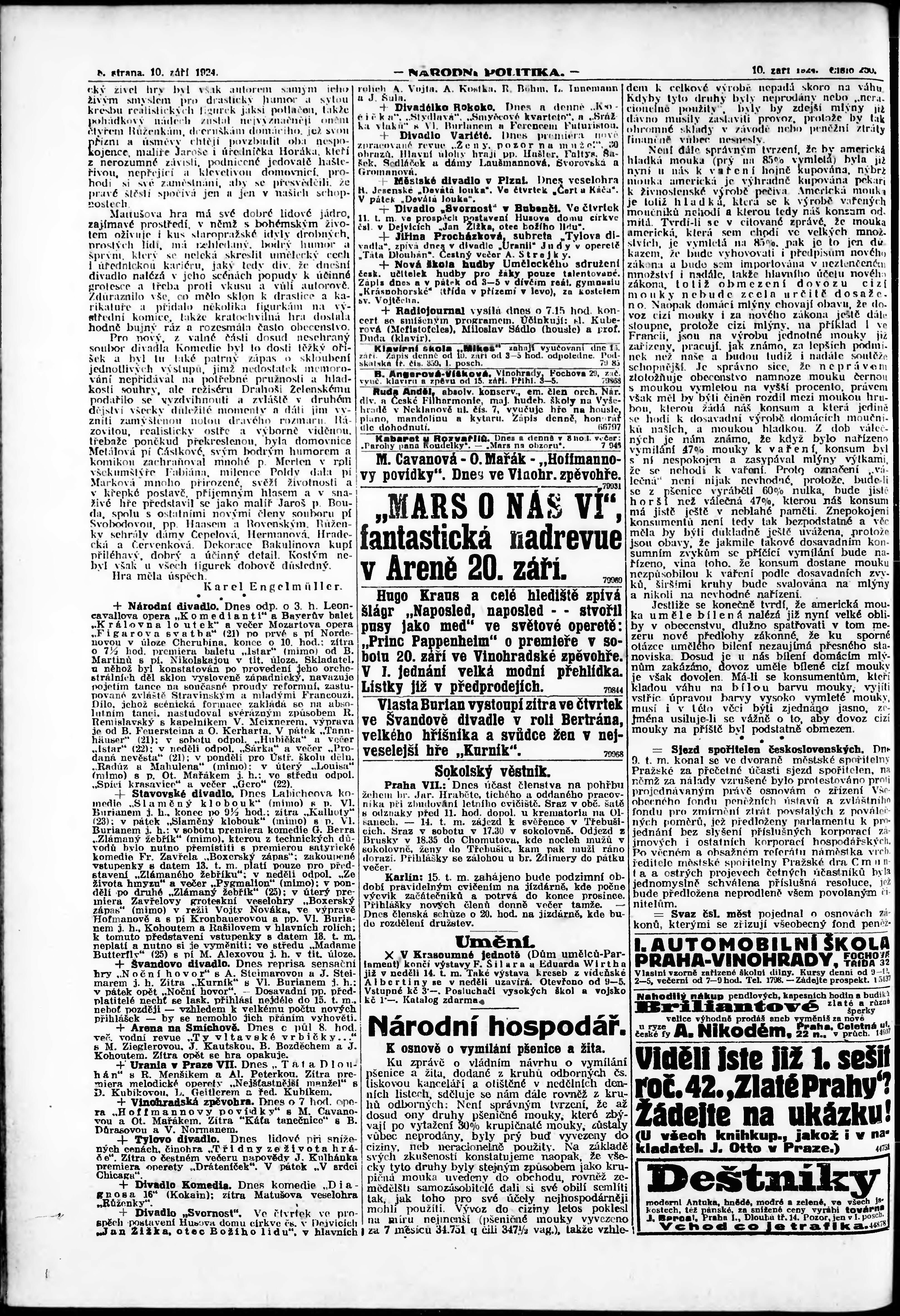 * Datum vydání výtisku: 10.9.1924 Číslo výtisku: 250 Poznámky k výtisku: ranní vydání; vydání pro Prahu;