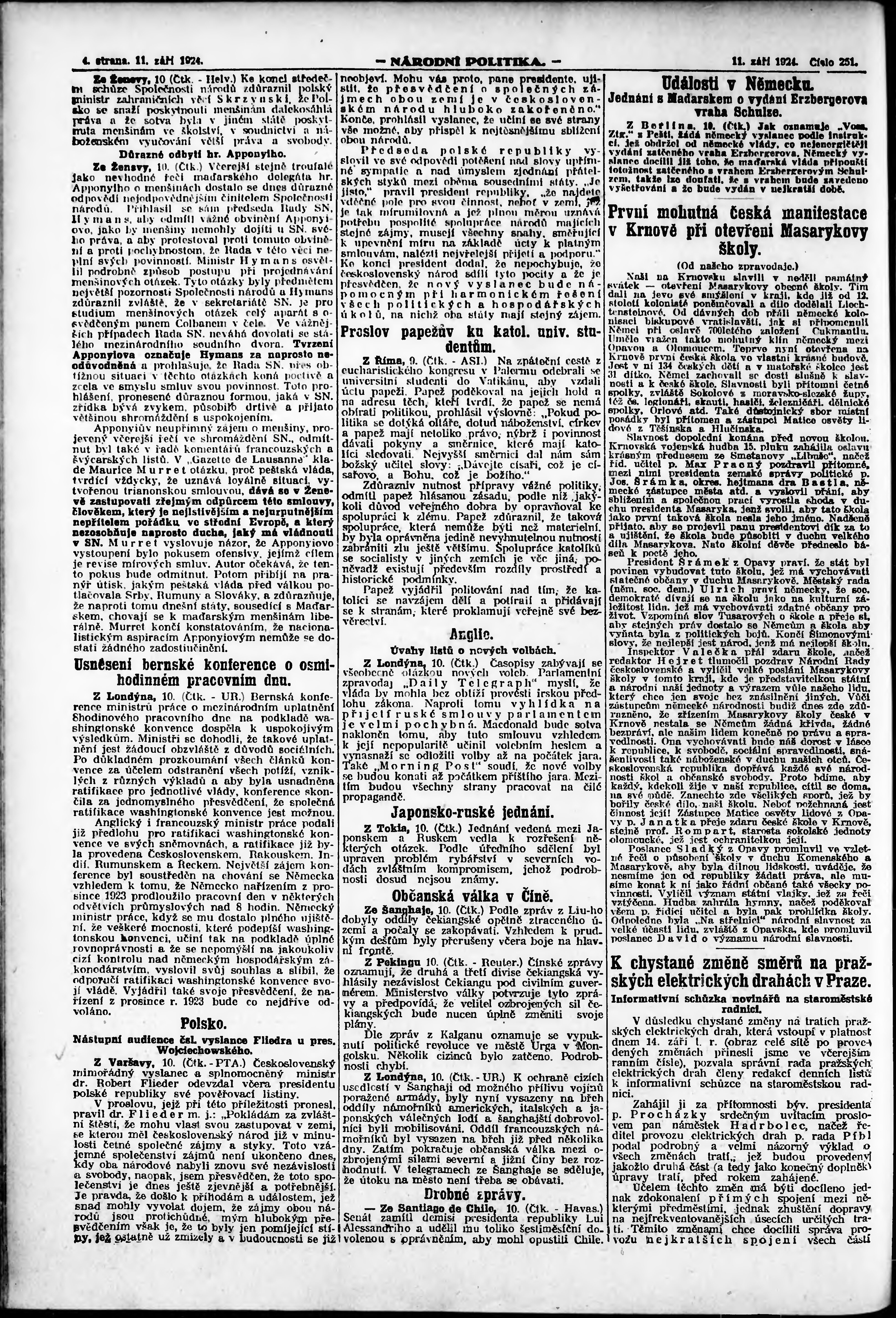 * Datum vydání výtisku: 11.9.1924 Číslo výtisku: 251 Poznámky k výtisku: ranní vydání; vydání pro Prahu;
