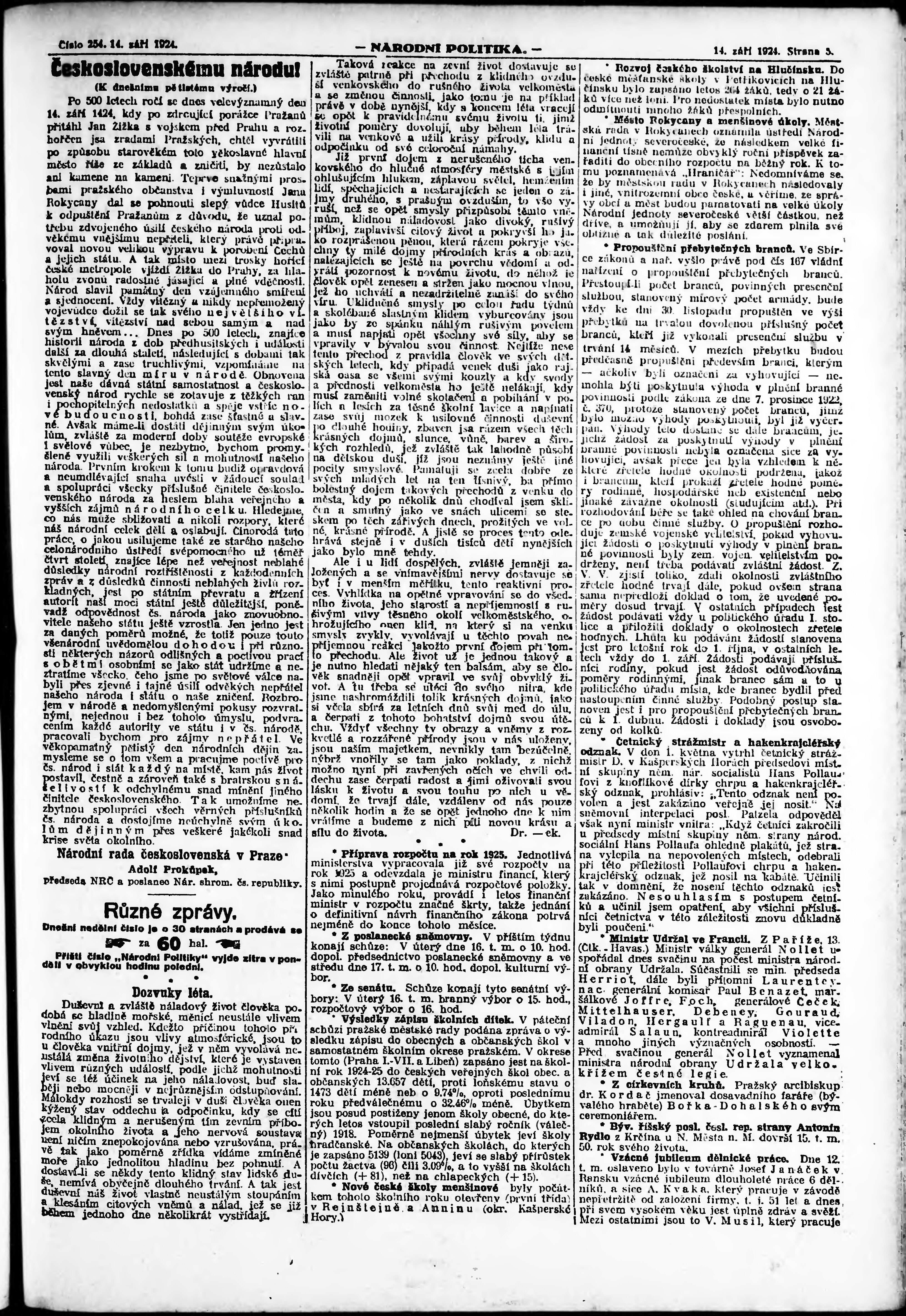 * Datum vydání výtisku: 14.9.1924 Číslo výtisku: 254 Poznámky k výtisku: ranní vydání;