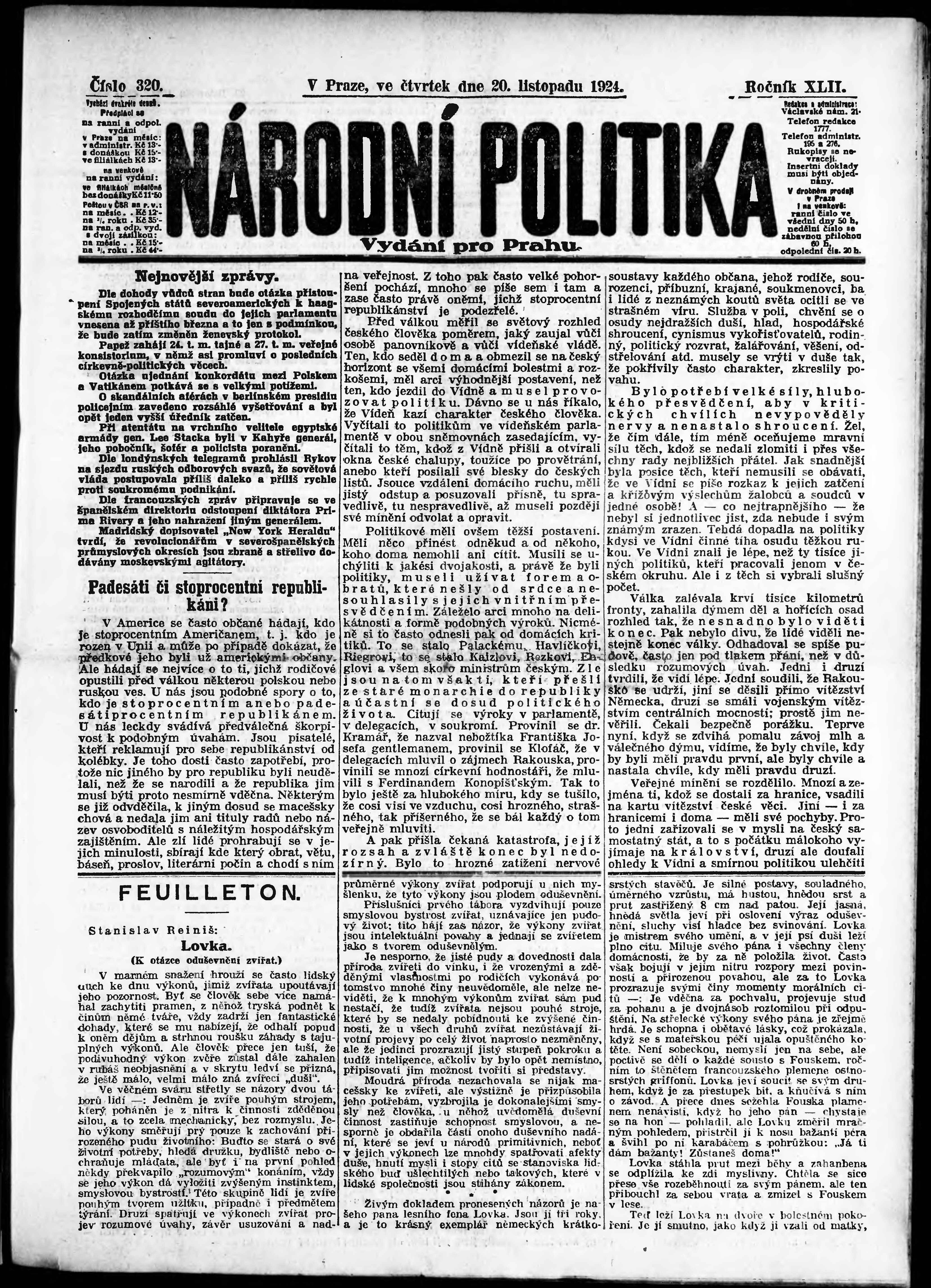 * Datum vydání výtisku: 20.11.1924 Číslo výtisku: 320 Poznámky k výtisku: ranní vydání; vydání pro Prahu;
