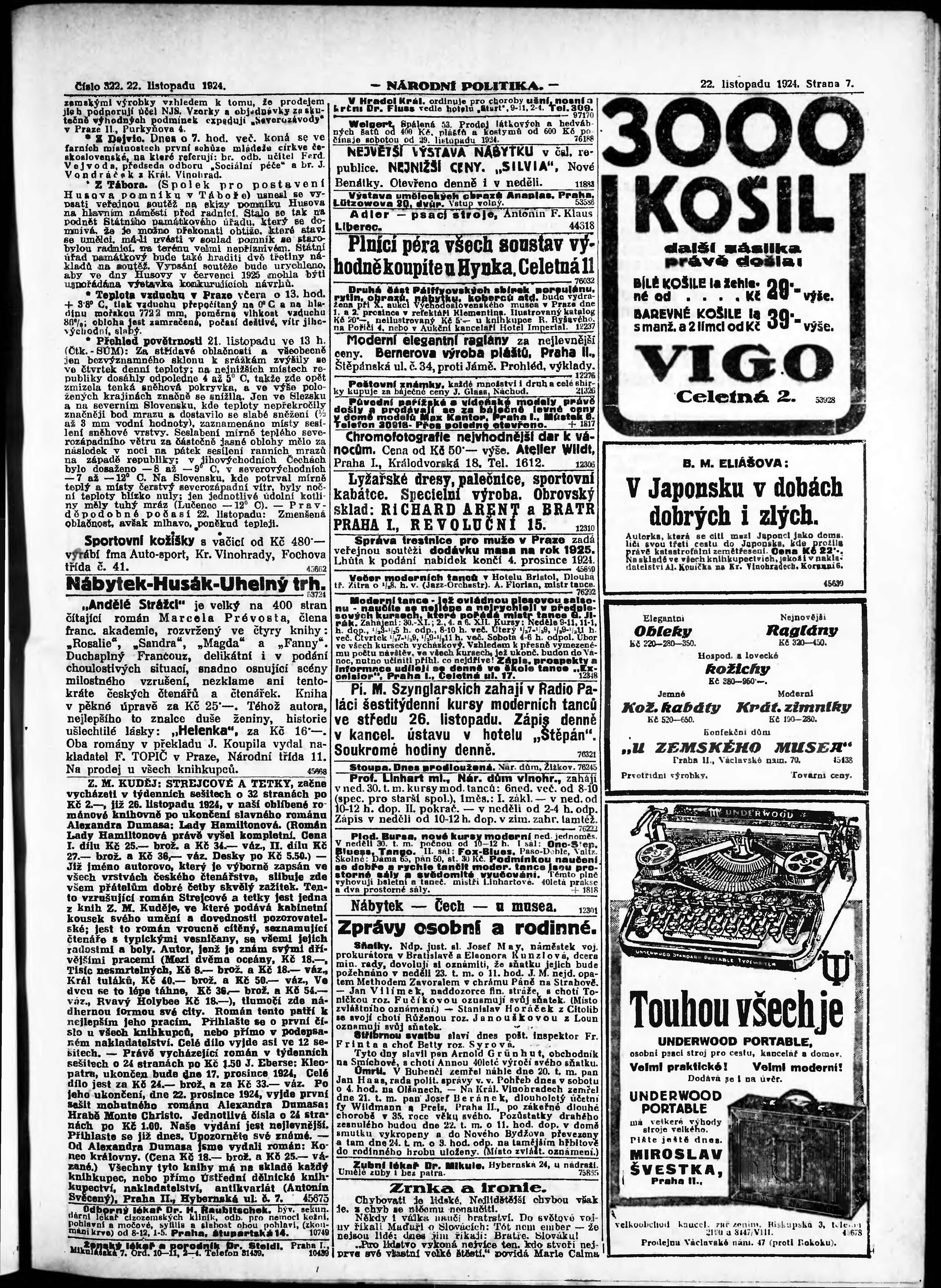* Datum vydání výtisku: 22.11.1924 Číslo výtisku: 322 Poznámky k výtisku: ranní vydání; vydání pro Prahu;