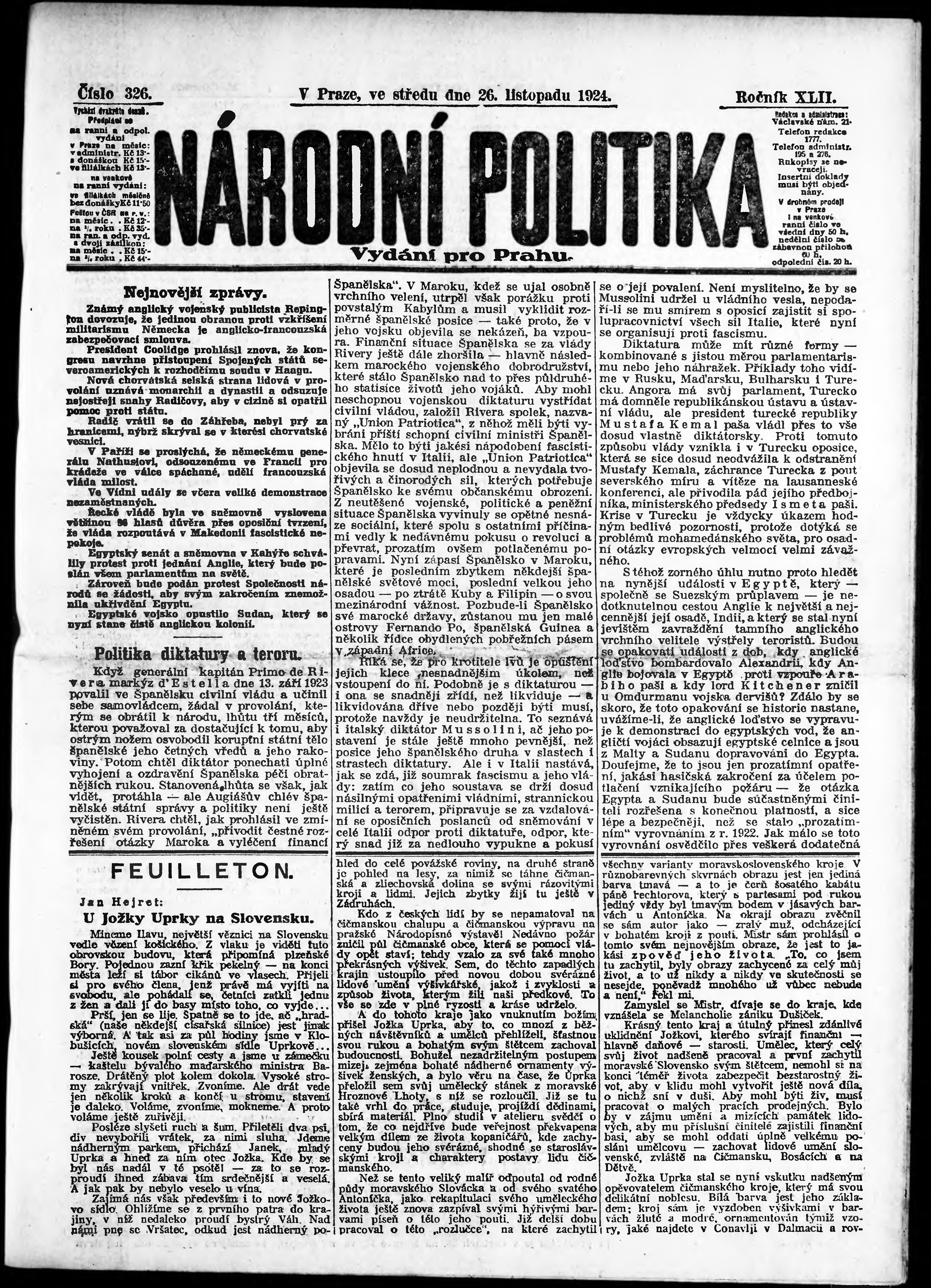 * Datum vydání výtisku: 26.11.1924 Číslo výtisku: 326 Poznámky k výtisku: ranní vydání; vydání pro Prahu;