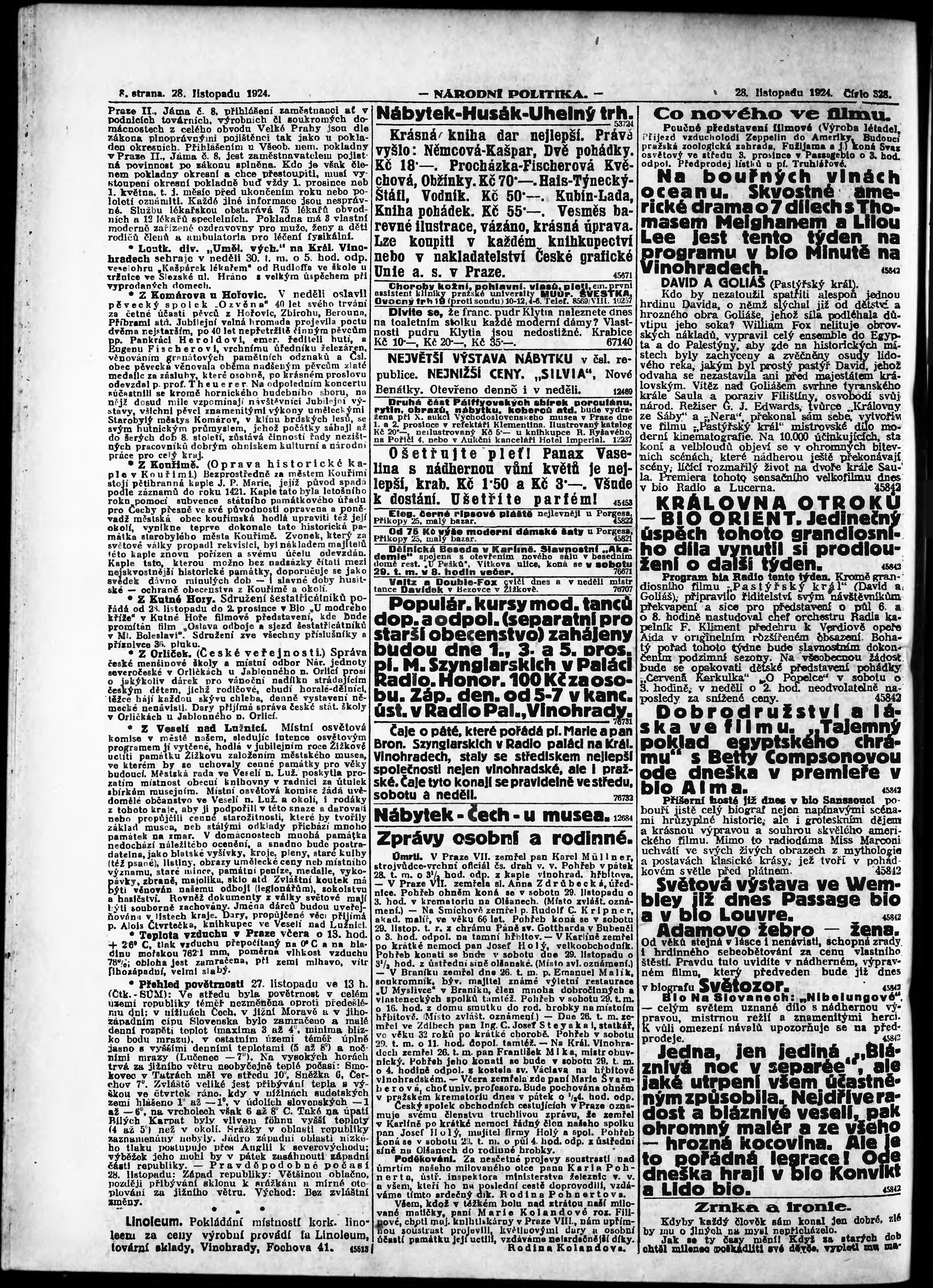 * Datum vydání výtisku: 28.11.1924 Číslo výtisku: 328 Poznámky k výtisku: ranní vydání; vydání pro Prahu;
