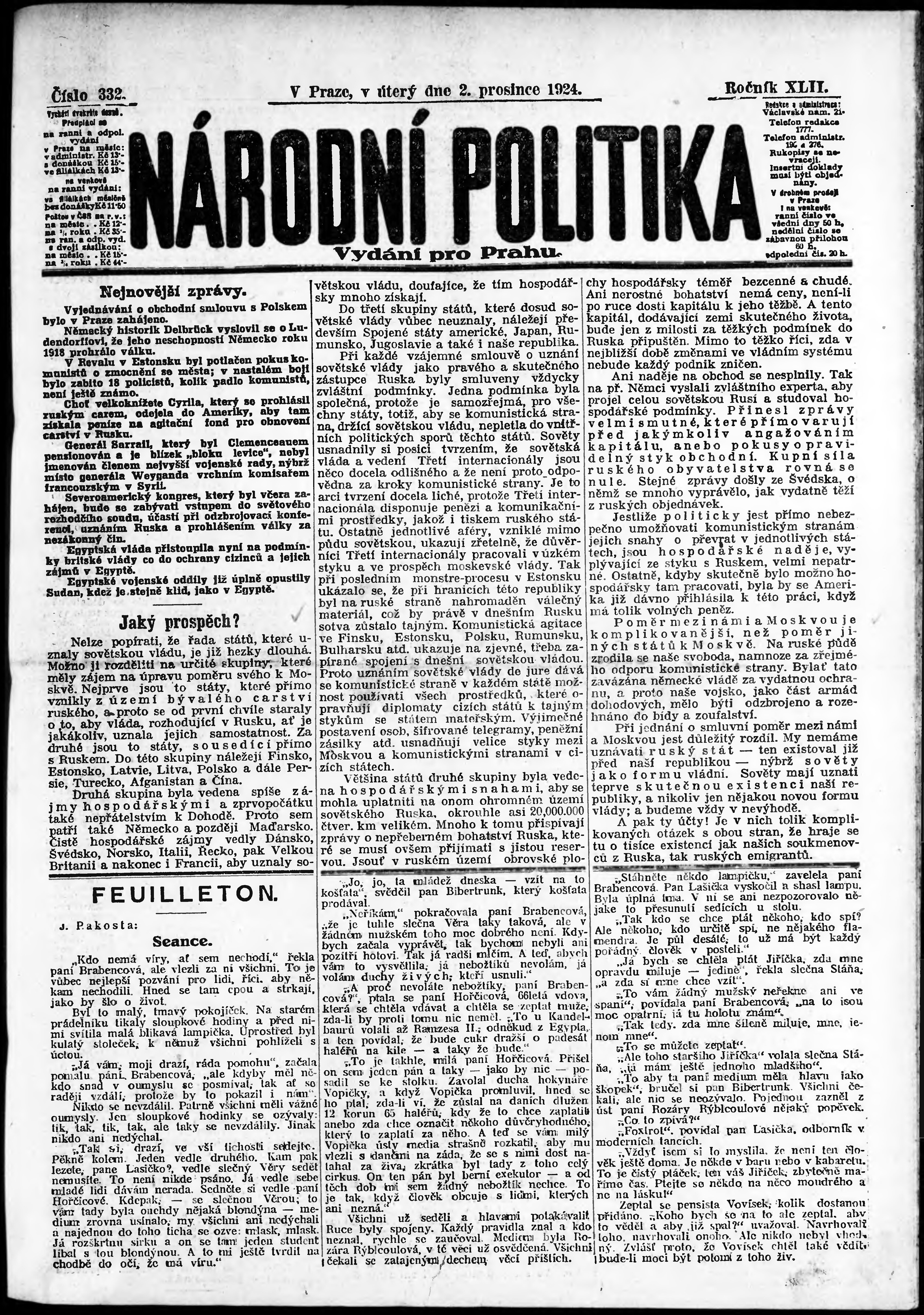 * Datum vydání výtisku: 2.12.1924 Číslo výtisku: 332 Poznámky k výtisku: ranní vydání; vydání pro Prahu;