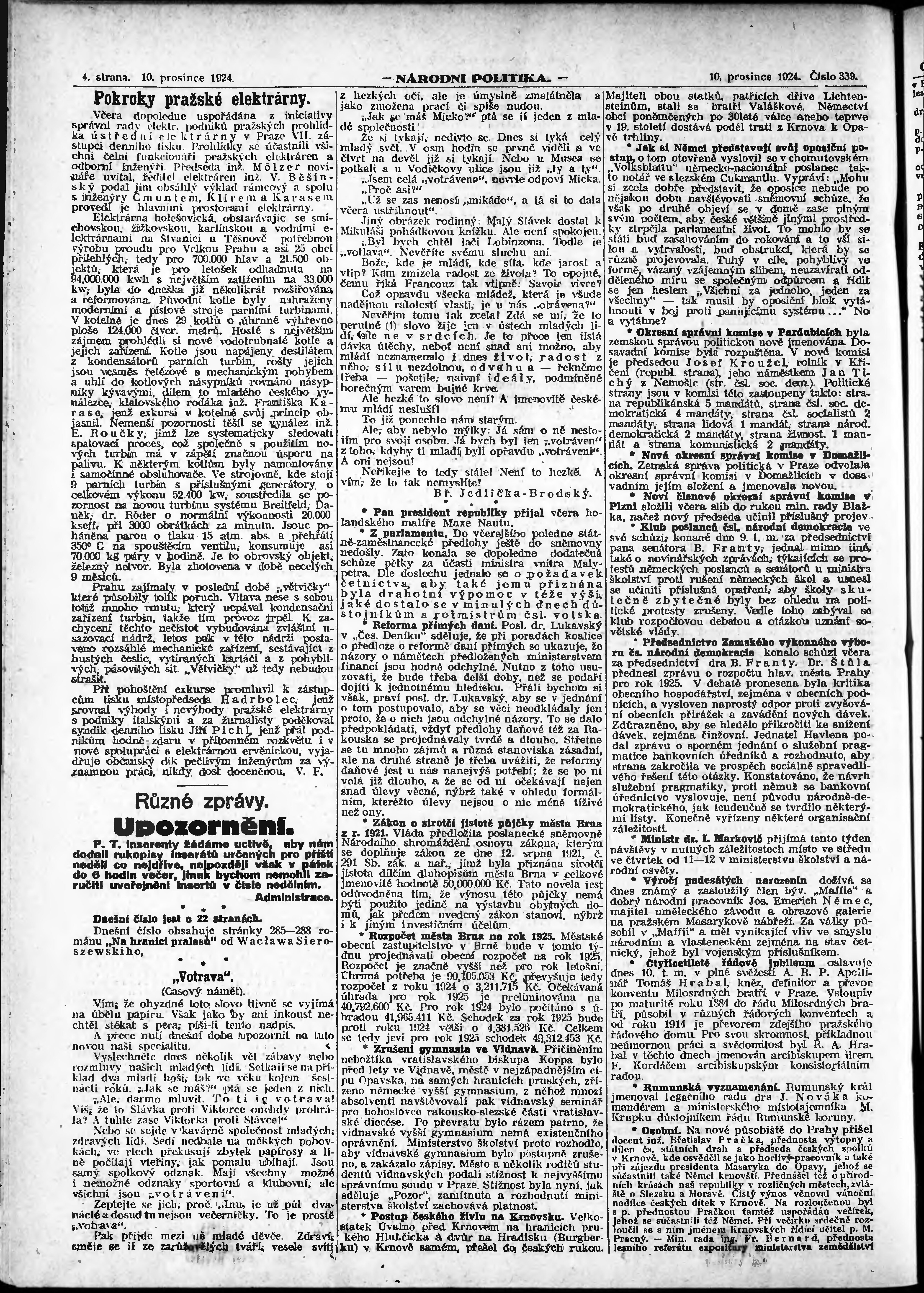 * Datum vydání výtisku: 10.12.1924 Číslo výtisku: 339 Poznámky k výtisku: ranní vydání; vydání pro Prahu;