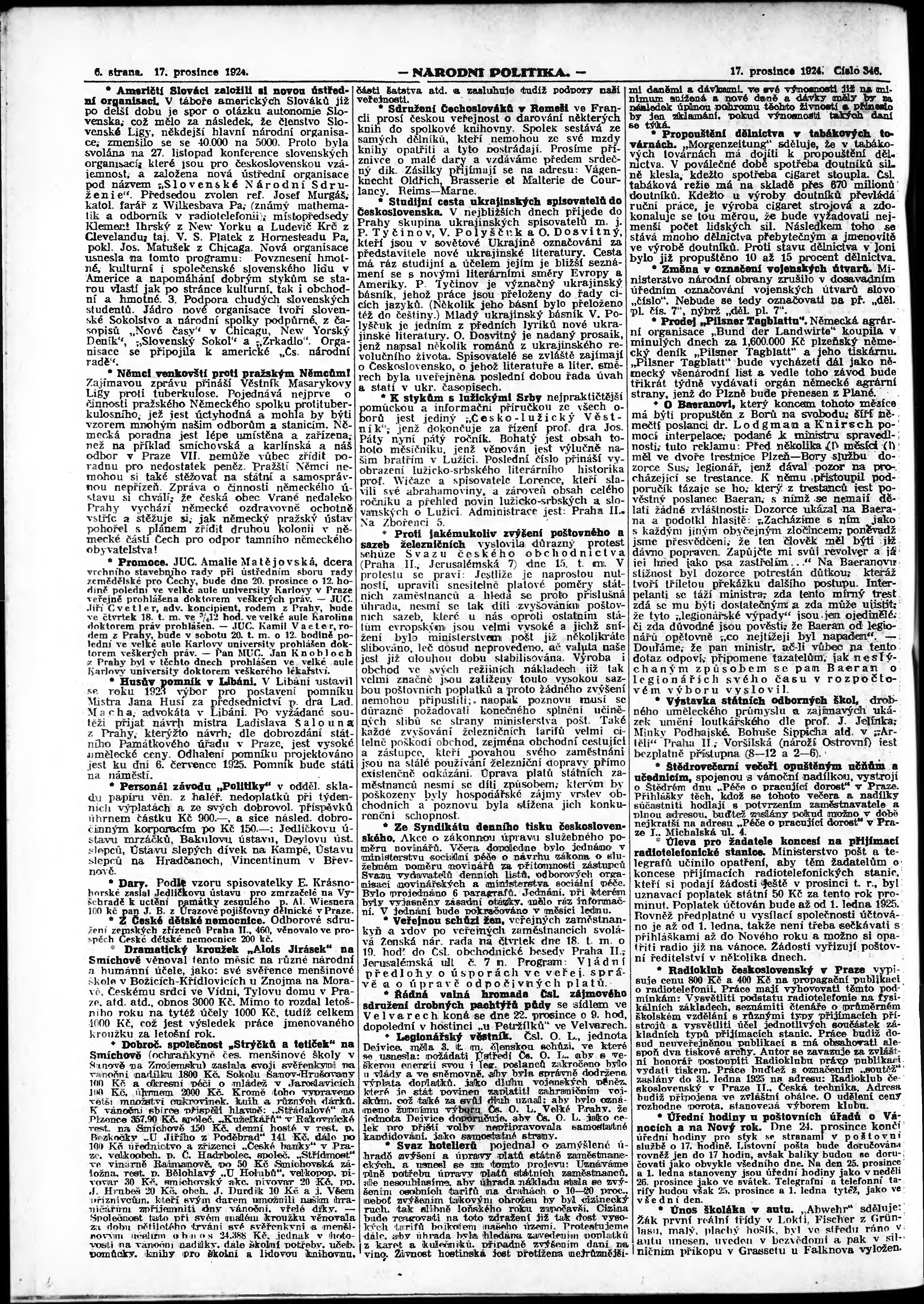 * Datum vydání výtisku: 17.12.1924 Číslo výtisku: 346 Poznámky k výtisku: ranní vydání; vydání pro Prahu;