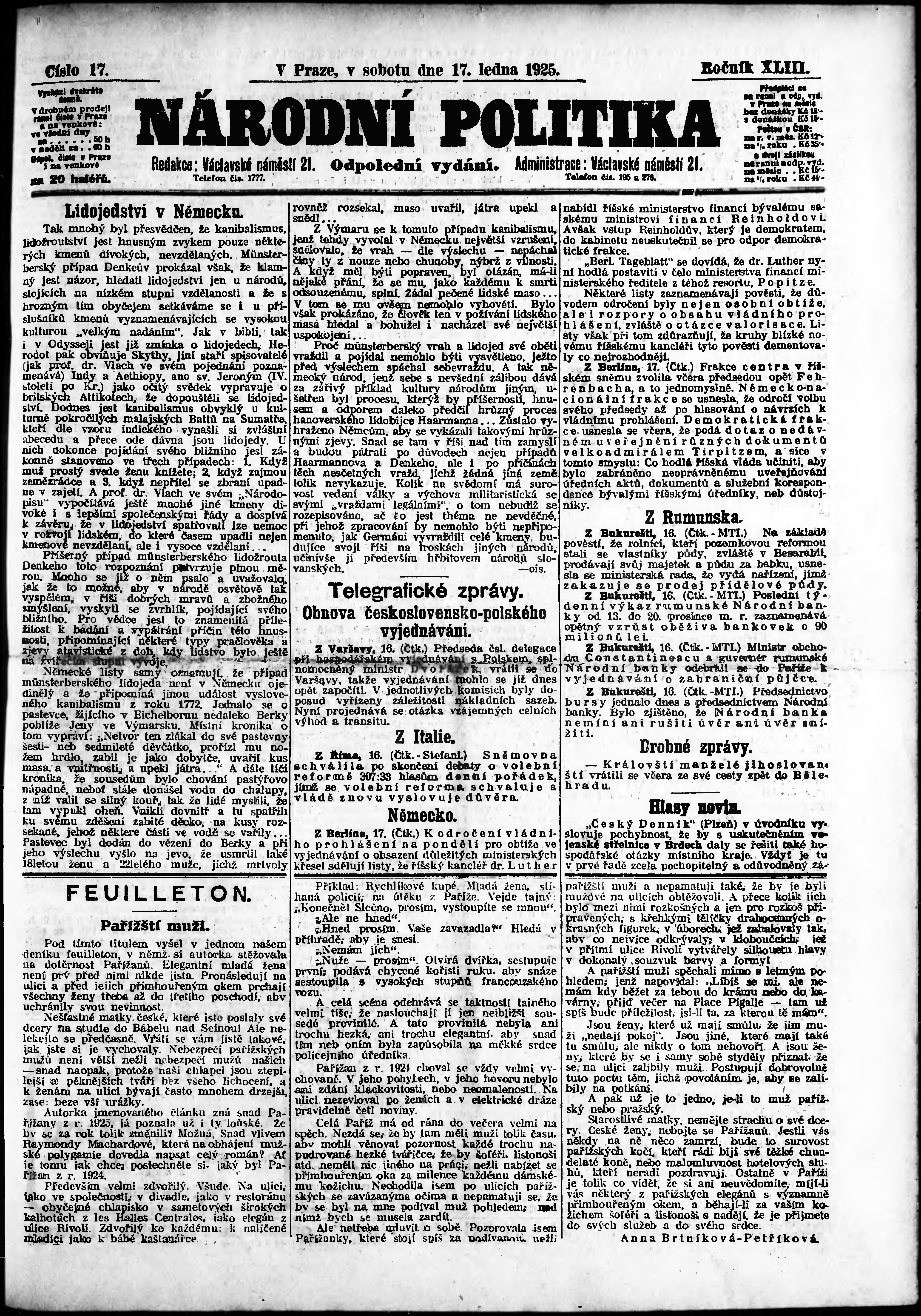* Datum vydání výtisku: 17.1.1925 Číslo výtisku: 17 Poznámky k výtisku: odpolední vydání;