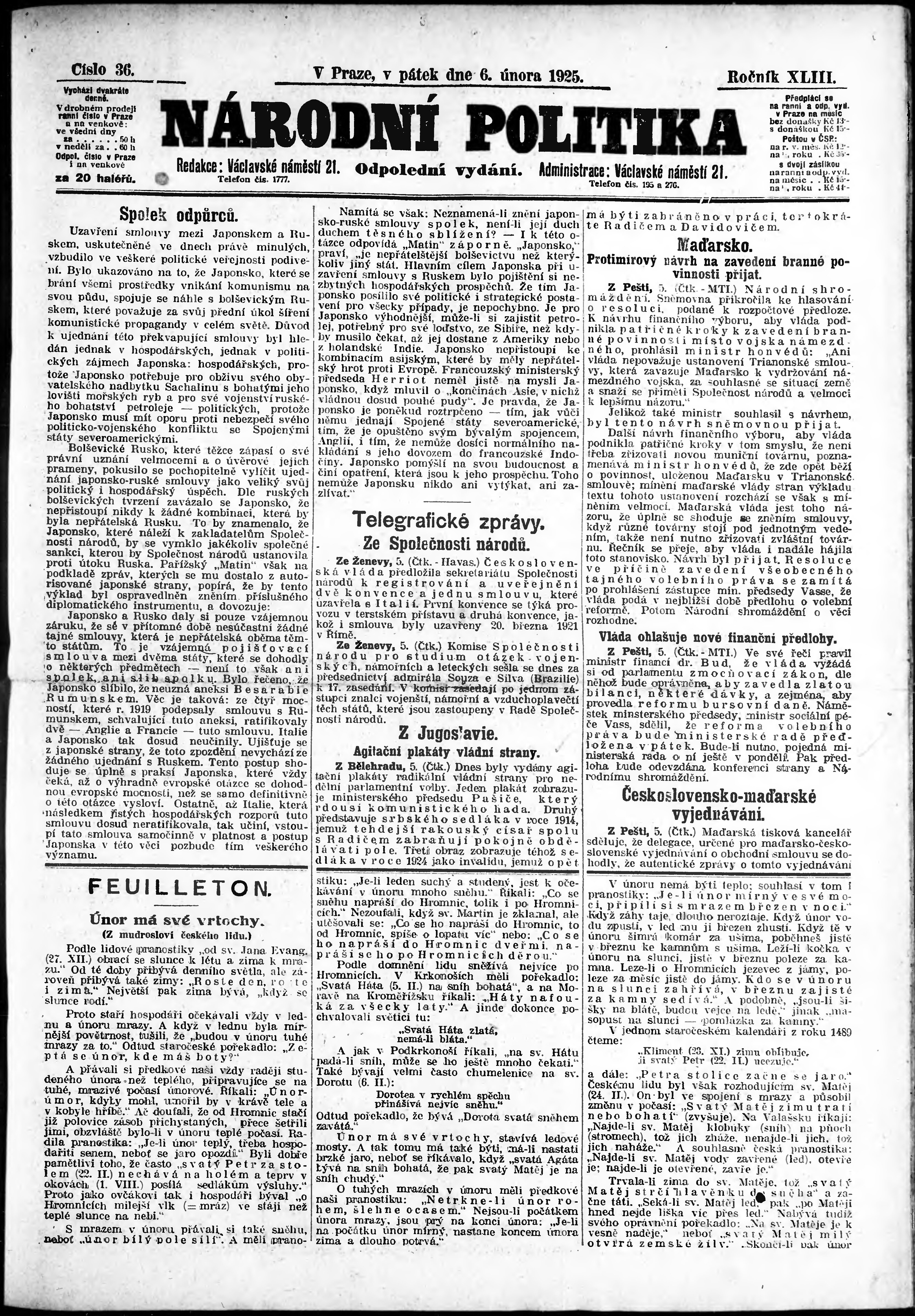 * Datum vydání výtisku: 6.2.1925 Číslo výtisku: 36 Poznámky k výtisku: odpolední vydání;