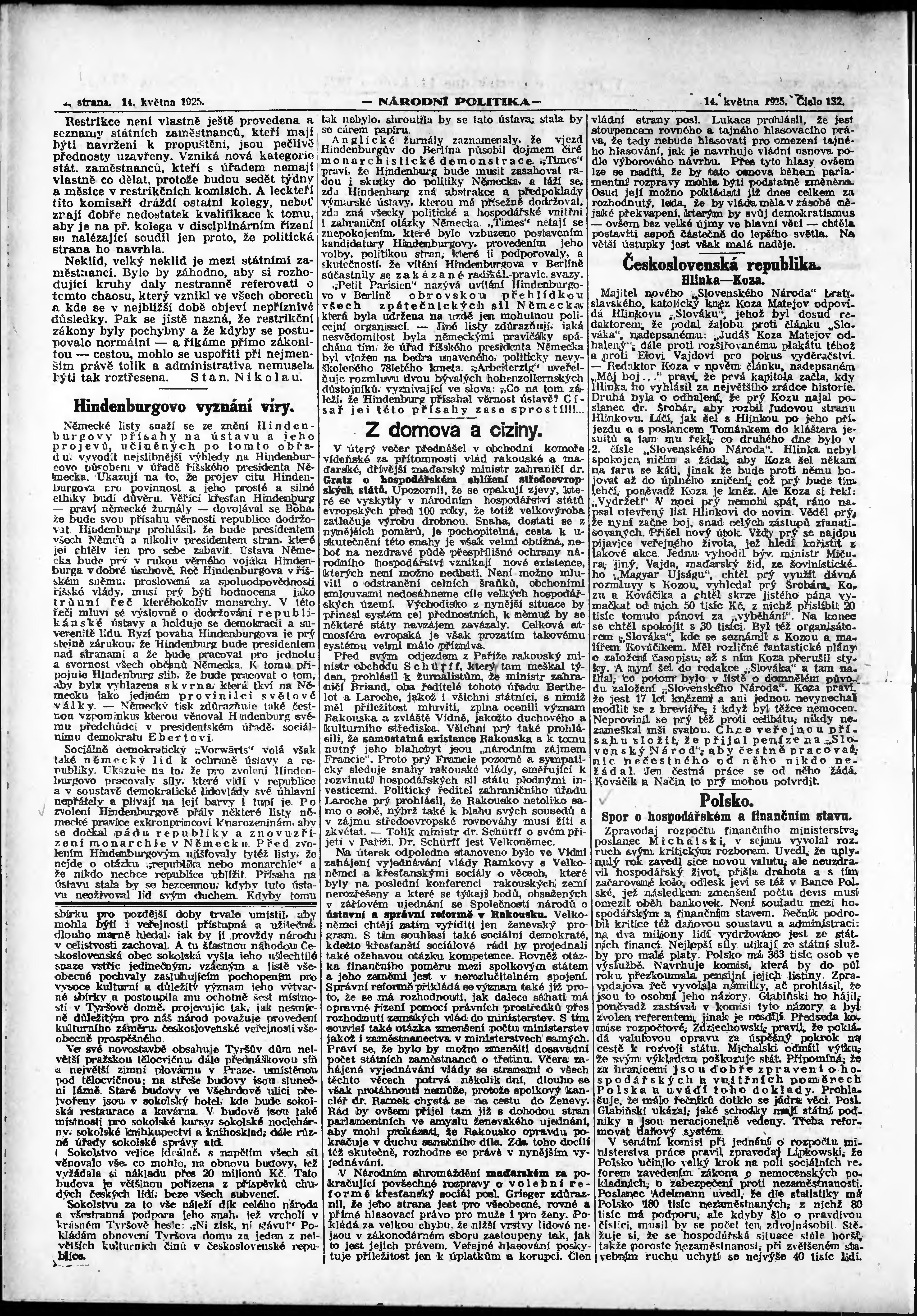 * Datum vydání výtisku: 14.5.1925 Číslo výtisku: 132 Poznámky k výtisku: ranní vydání; vydání pro Prahu;