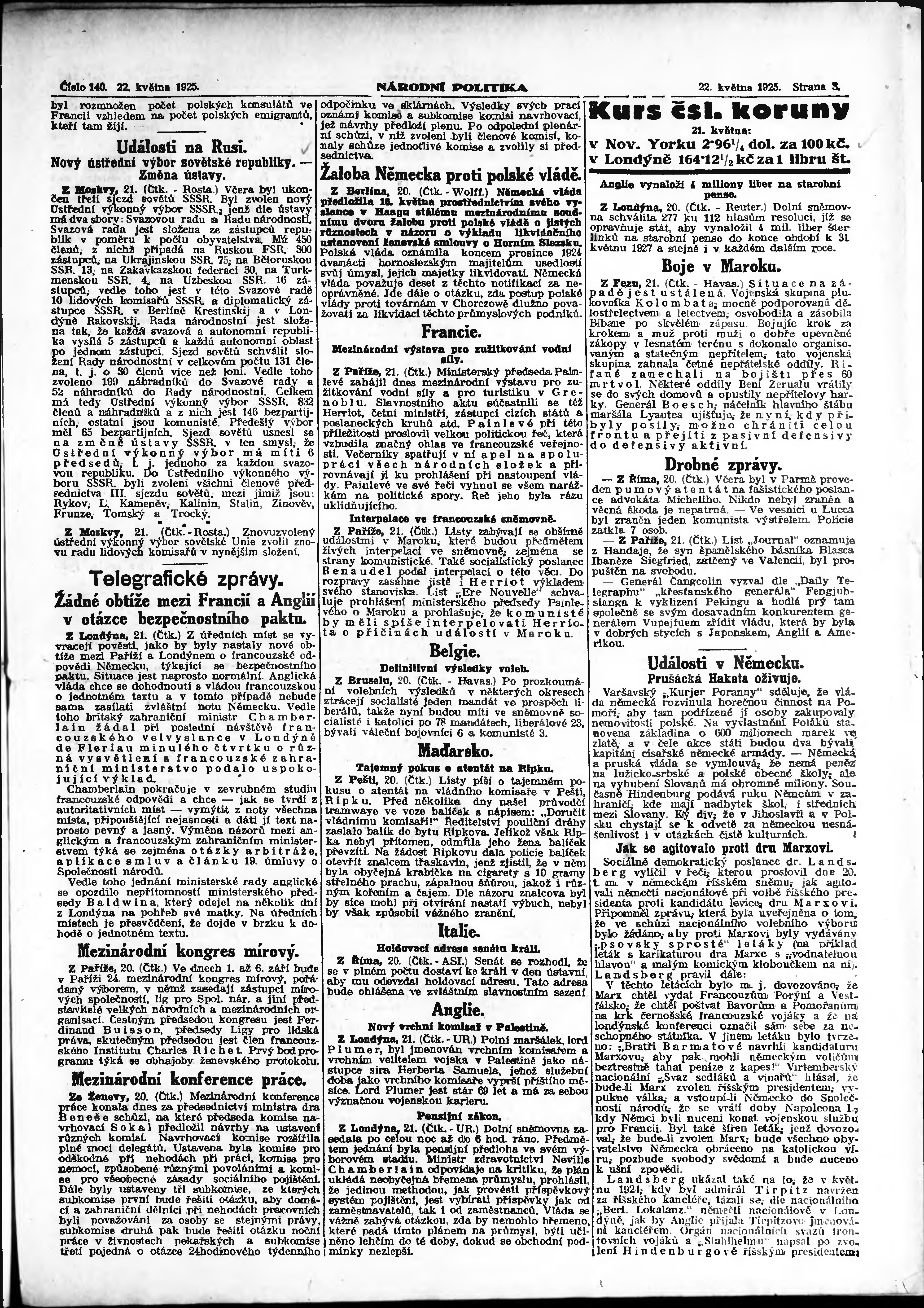 * Datum vydání výtisku: 22.5.1925 Číslo výtisku: 140 Poznámky k výtisku: ranní vydání; vydání pro Prahu;