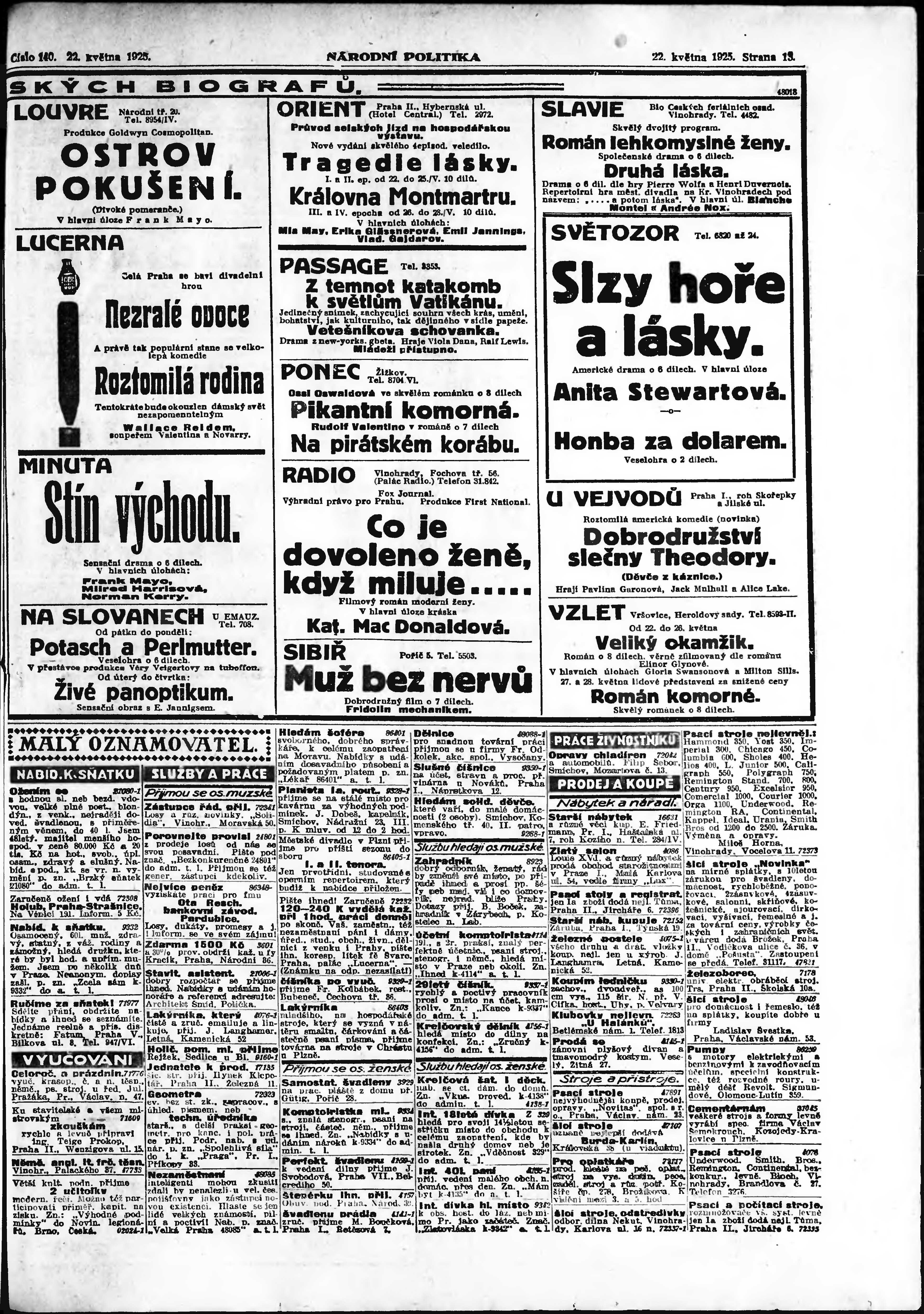 * Datum vydání výtisku: 22.5.1925 Číslo výtisku: 140 Poznámky k výtisku: ranní vydání; vydání pro Prahu;