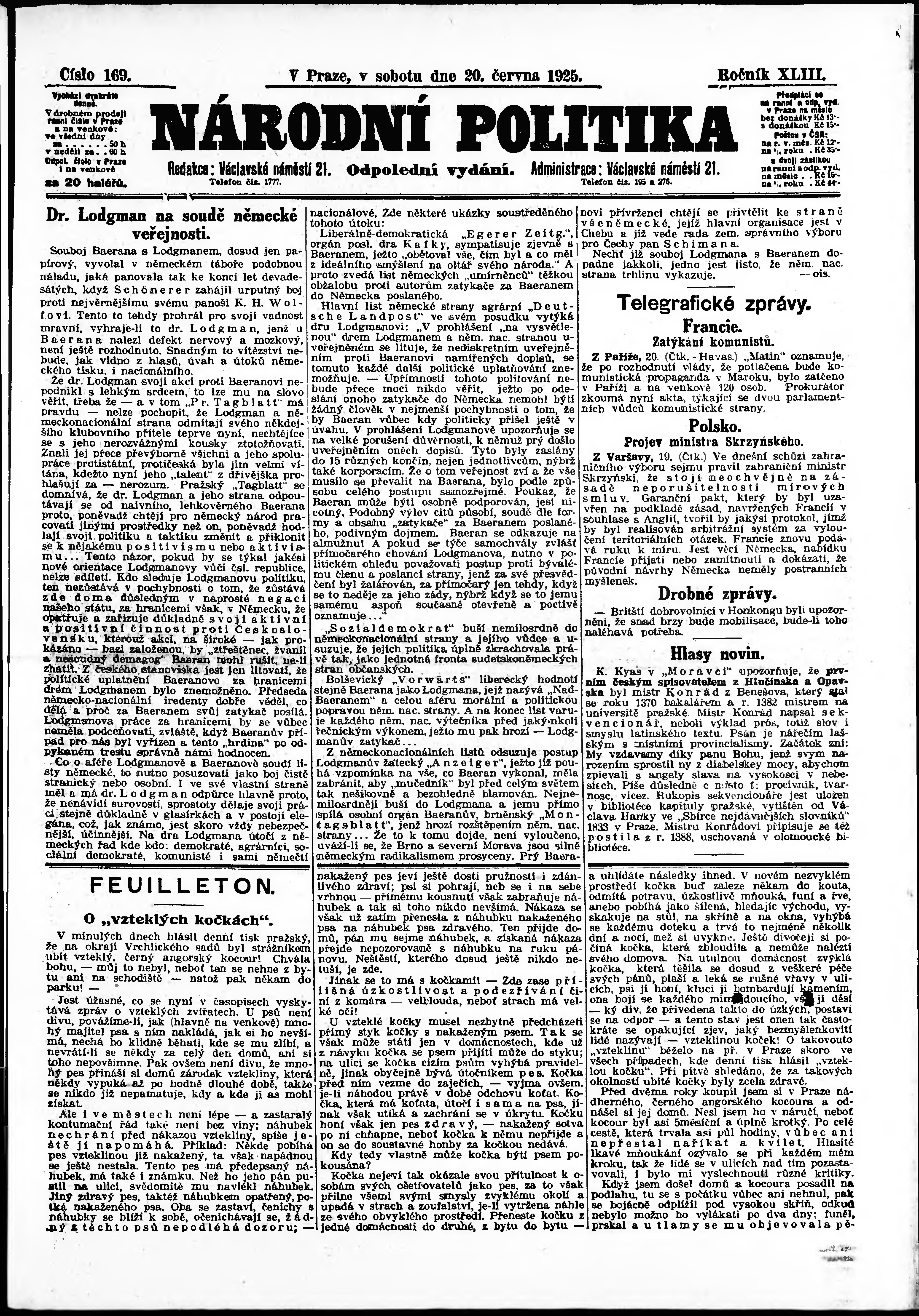 * Datum vydání výtisku: 20.6.1925 Číslo výtisku: 169 Poznámky k výtisku: odpolední vydání;